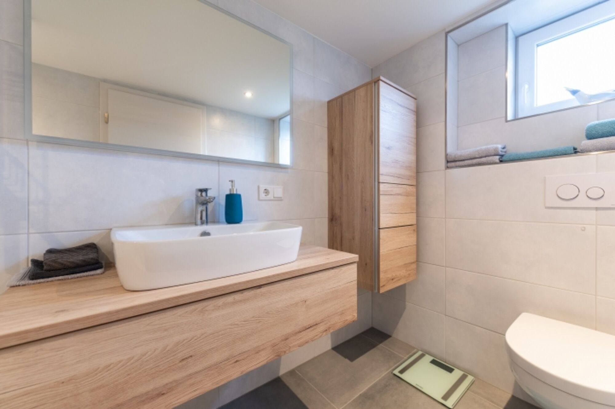 Waschbecken, Spiegel, Fenster im Bad