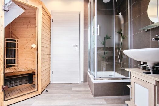 Badezimmer: 1 Vollbad mit ebenerdiger Dusche und WC im EG; Fußboden: Fliesen mit Fußbodenheizung, 1 Duschbad mit WC und Infrarotsauna im OG; Fußboden: Fliesen