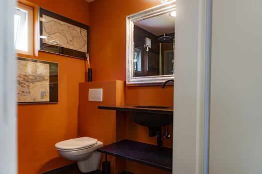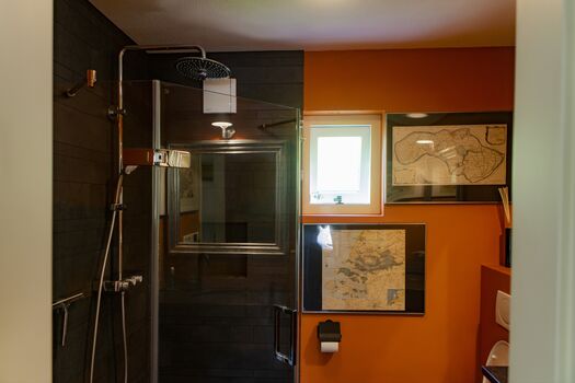 Das Haus hat einen wireless Internetanschluss. Den notwendigen Laptop müssten Sie selbst mitbringen. Ebenfalls im Parterre befindet sich ein Schlafzimmer mit einem Boxspringbett für zwei Personen (Länge 210 cm) und ein zweiter Fernsehapparat. Im Badezimmer sind Toilette, Waschbecken und eine große Dusche.