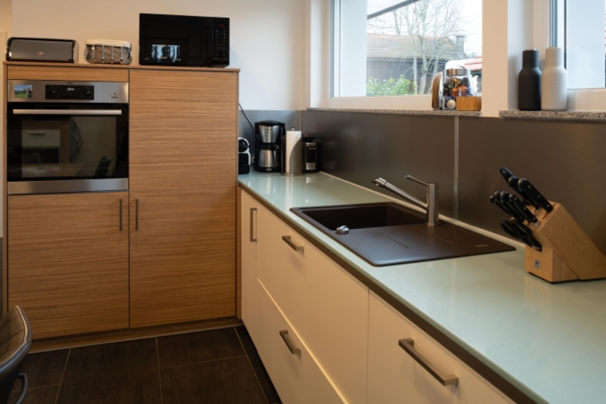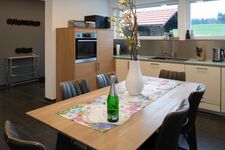 Induktionsherd, Dunstabzugshaube, Kühlschrank mit Gefrierfach, Korkenzieher / Flaschenöffner, Geschirrhandtücher, Mülltüten, Essplatz in der Küche