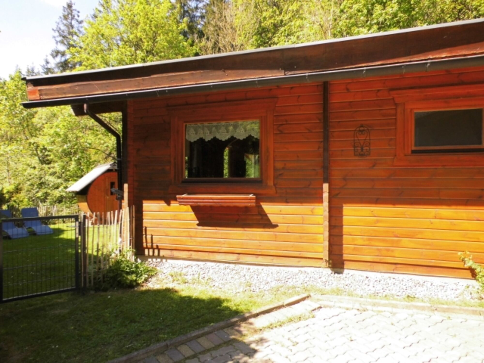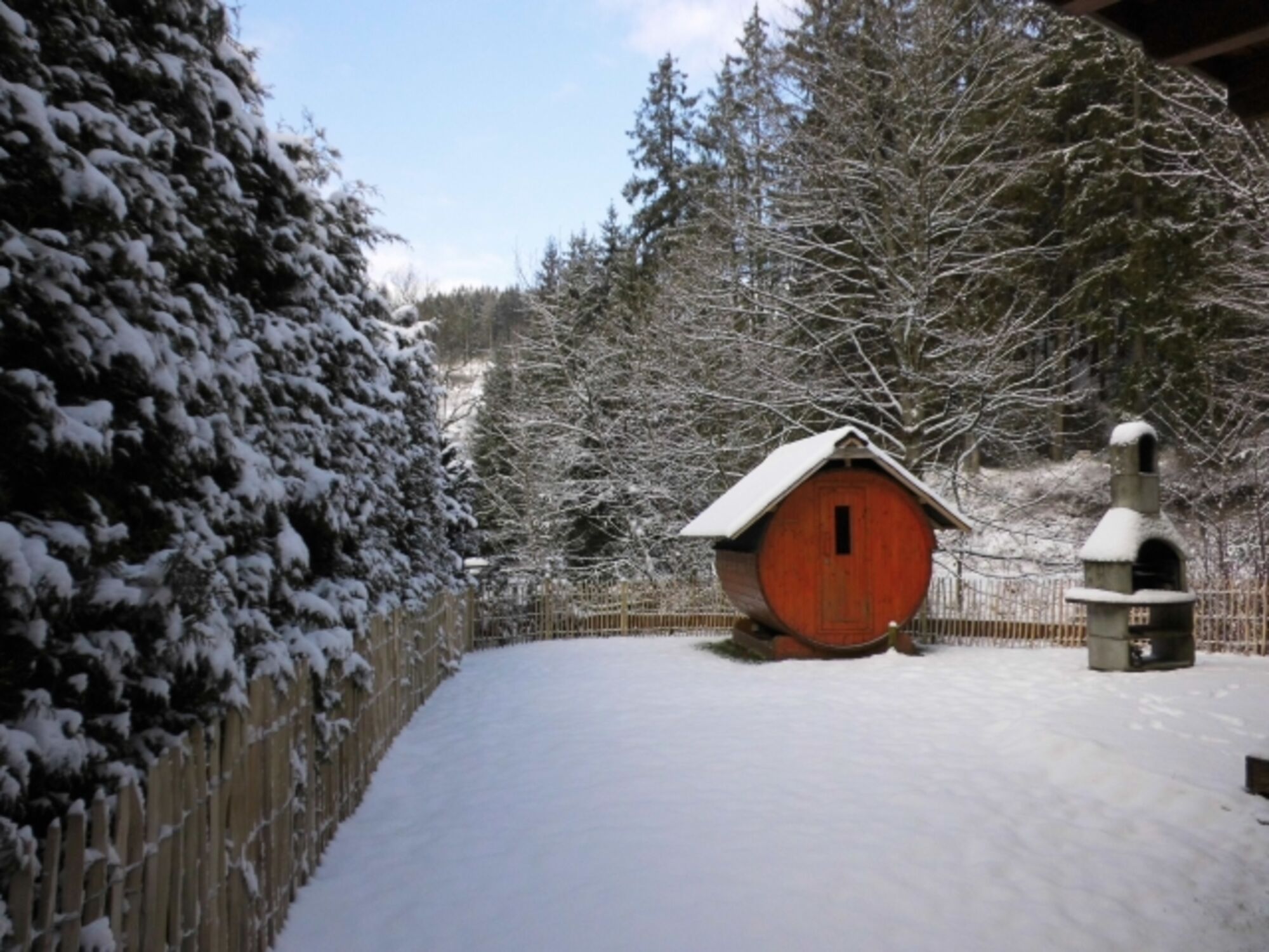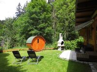 Blockhaus mit eingezäunter Wiese, Fass-Sauna, Grillkamin direkt am Wald