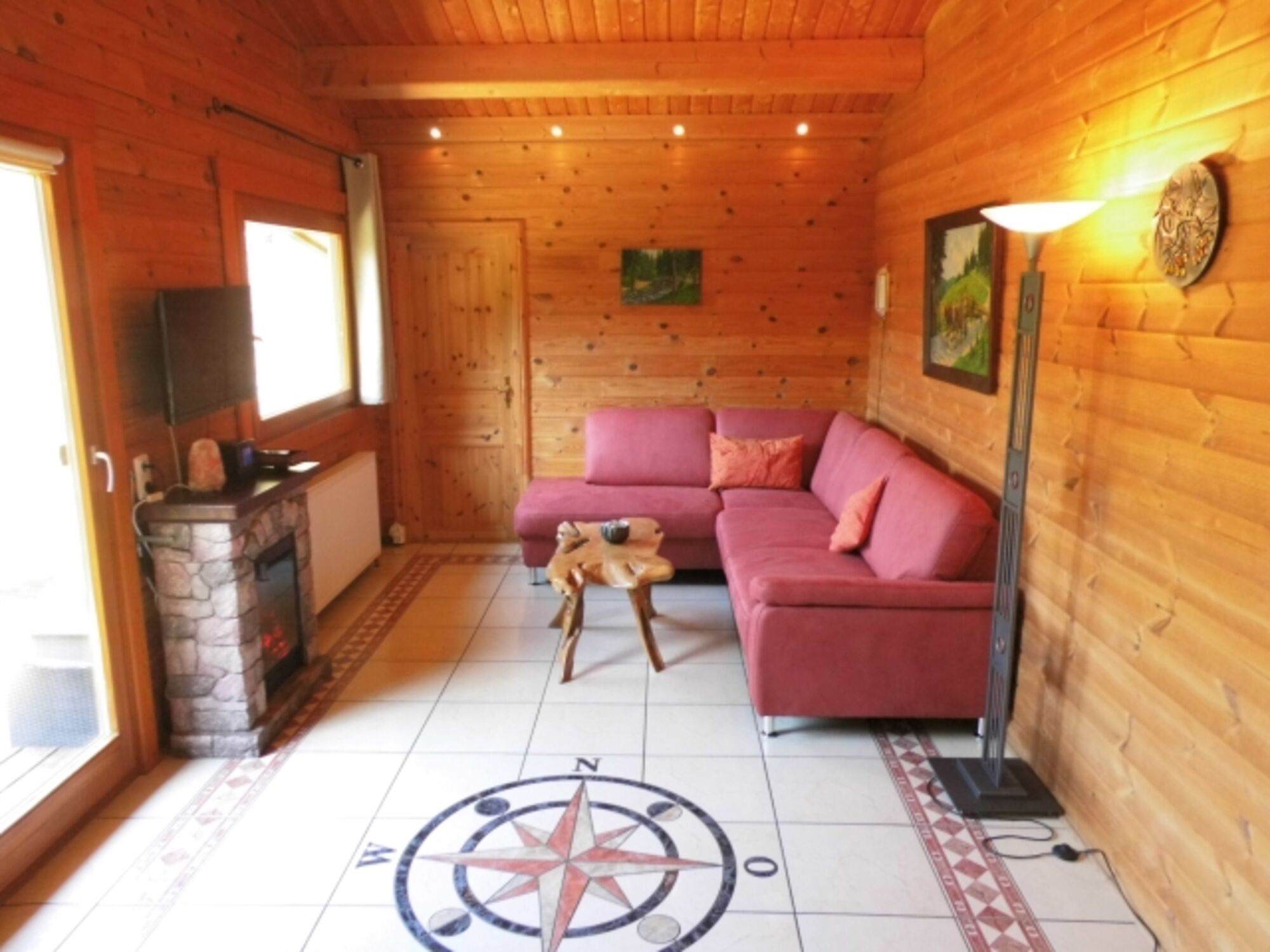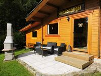 Das Blockhaus hat eine Terrasse mit Gartenmöbeln, Grillkamin und ist umgeben von einer großen, komplett eingezäunten Wiese mit Fass-Sauna. Direkt vor dem Haus steht ein PKW-Stellplatz zur Verfügung.
