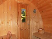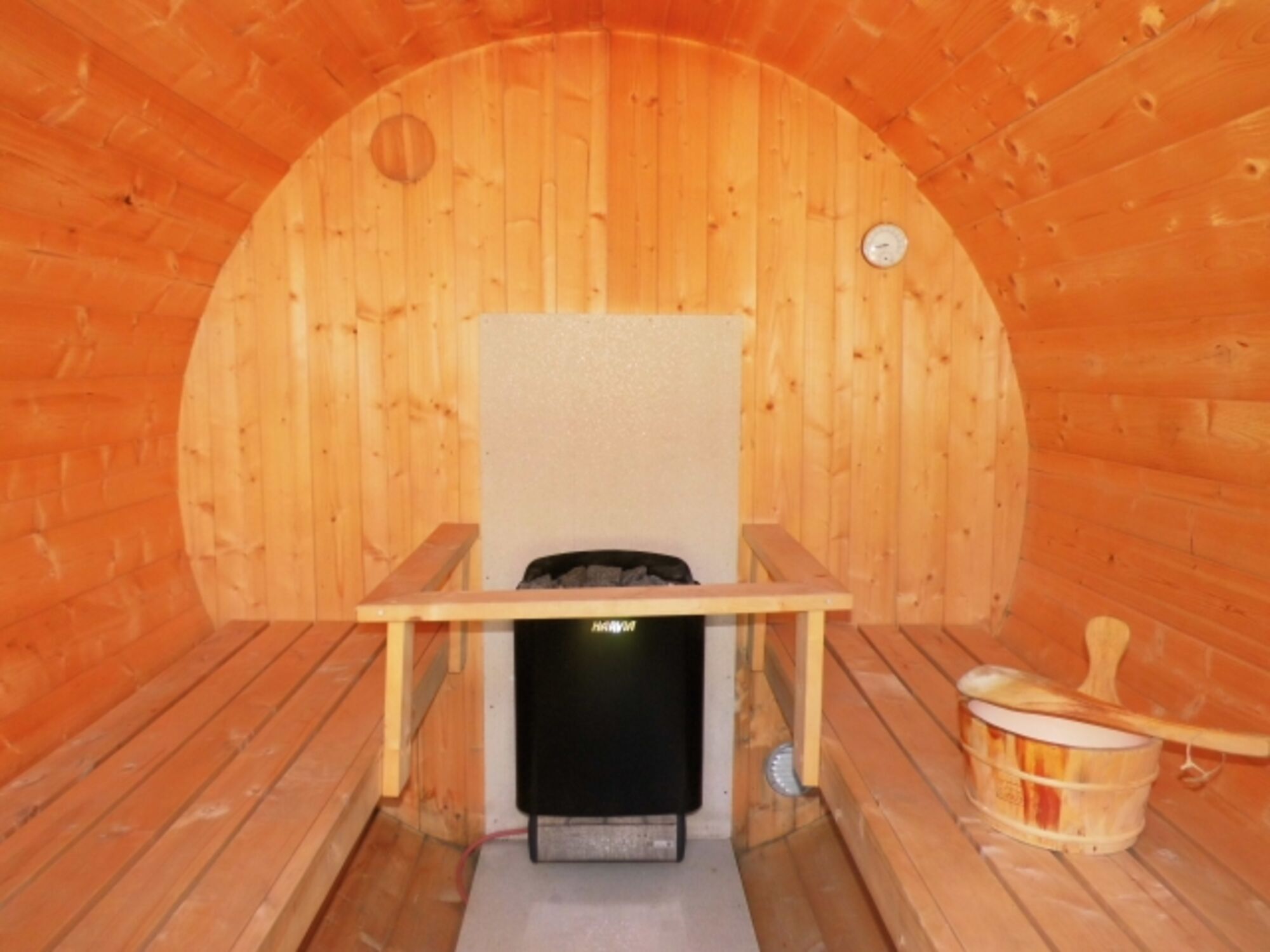 Die Fass-Sauna ist mit einem Münzzähler ausgestattet.
