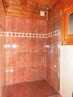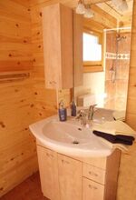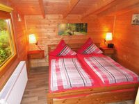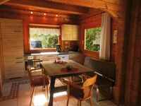 Das Blockhaus ist aufgeteilt in Flur, offener Wohnküche, Wohnzimmer, Bad und 2 Schlafzimmer. Ein Schlafzimmer ist mit einem 1,80 m breiten Doppelbett ausgestattet und das zweite Schlafzimmer mit einem 2 m breiten Doppelbett. Die Fußböden sind gefließt und die Holzwände unbehandelt. Das Blockhaus wird mit einer Gaszentralheizung erwärmt.