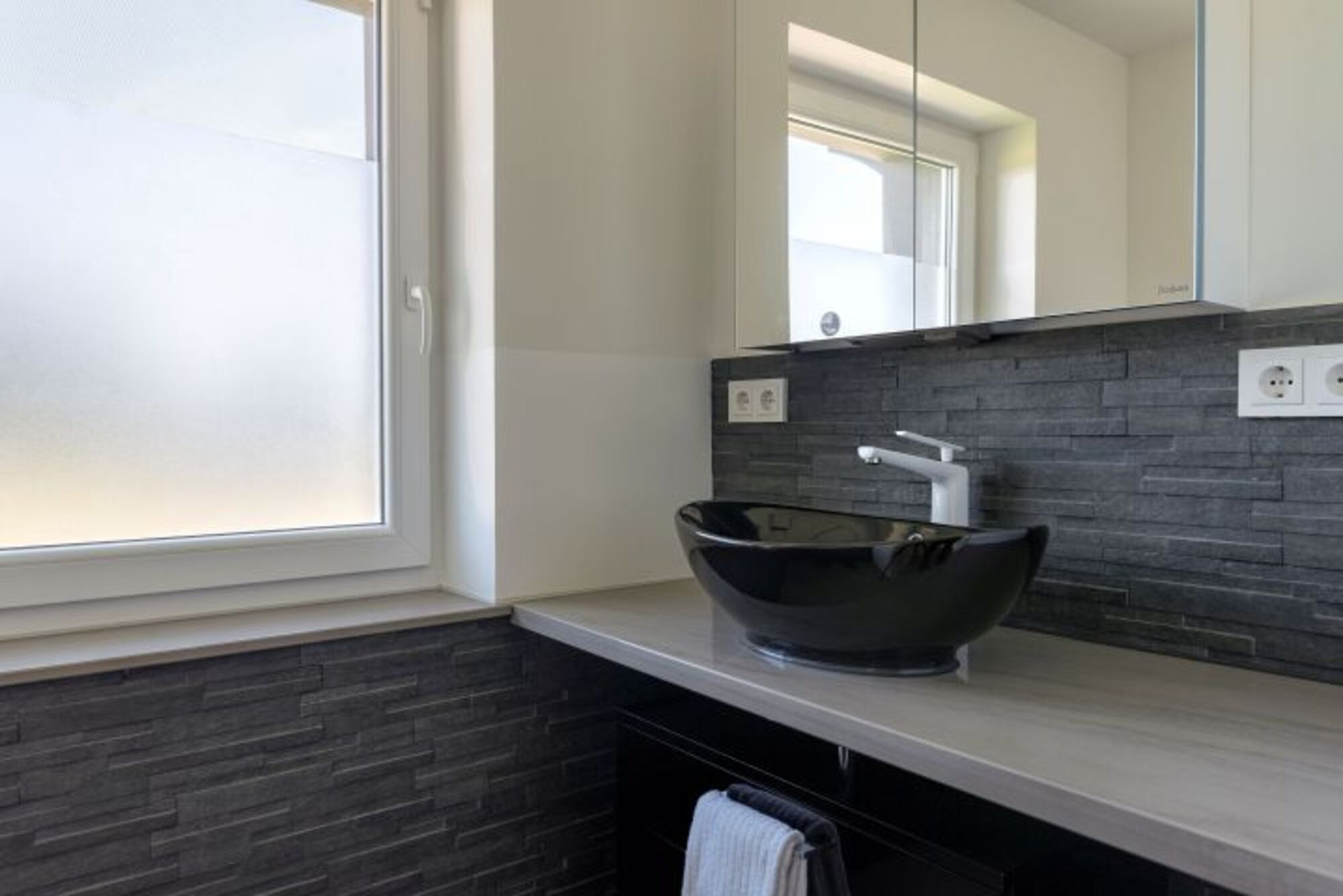Waschbecken, Regendusche, Spiegel, Fenster im Bad
