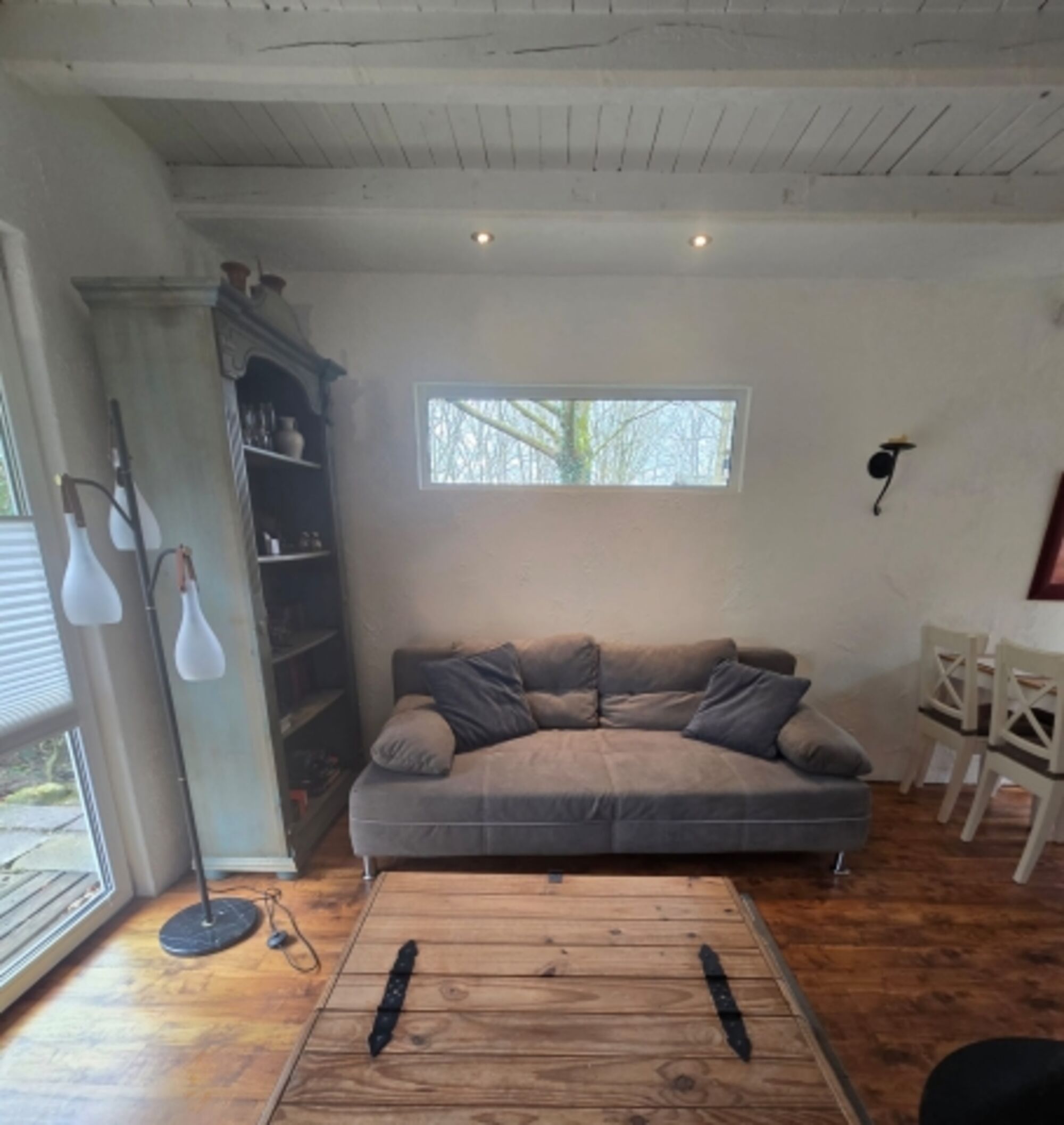 Im Erdgeschoss befindet sich das Wohnzimmer mit der offenen Küche und den Essplatz sowie das Badezimmer. Im Wohnzimmer steht eine Schlafcouch für eine zusätzliche Person. Das Haus wird an kalten Tagen mit Ofen beheizt.(Holz ist vorhanden)