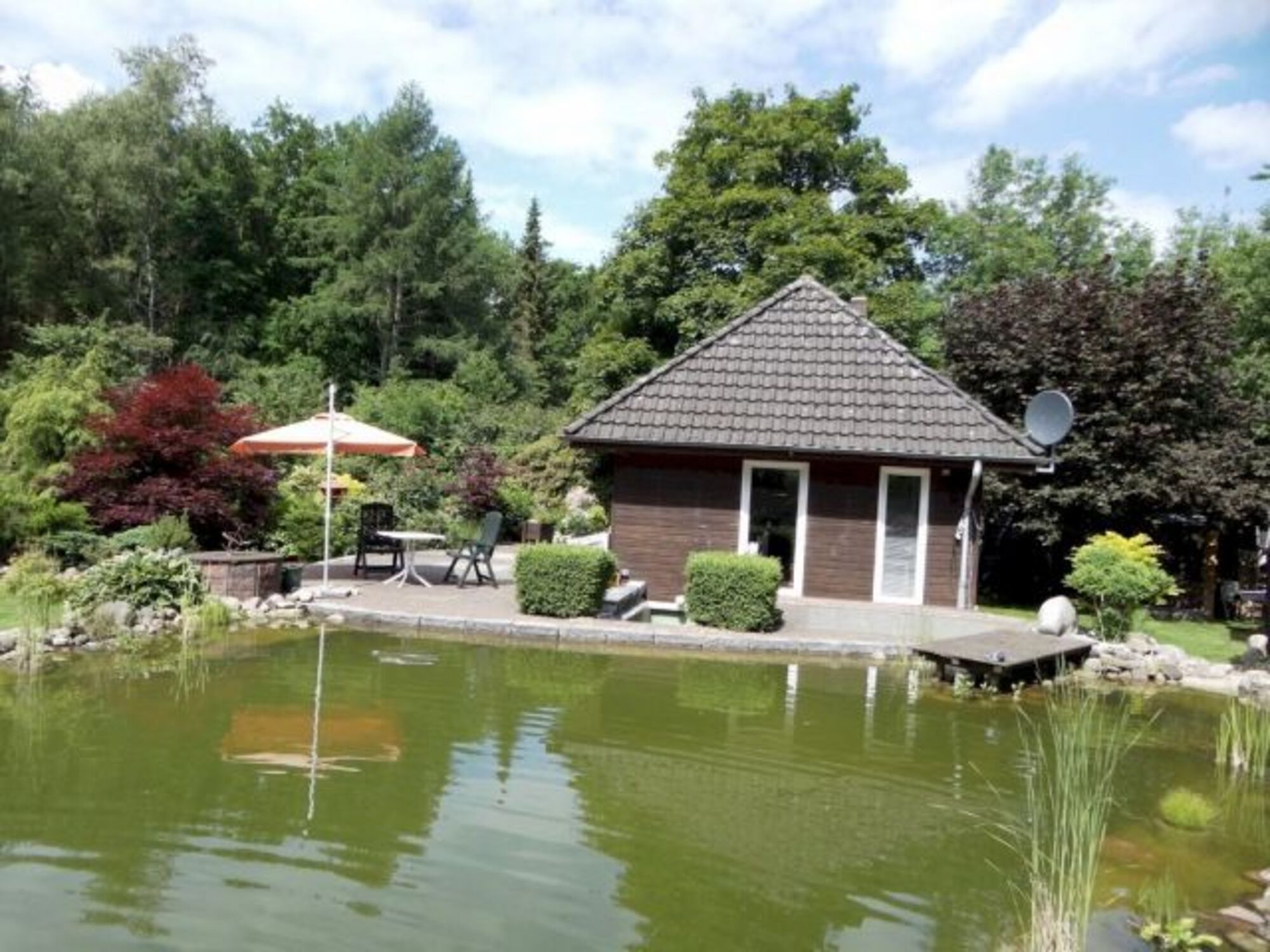 Unser kleines Ferienhaus bietet Platz für 2 Personen und max. 6 kleinen Hunden. Das Grundstück umfasst 2500m2 und ist komplett eingezäunt.Da es auf dem Grundstück einen großen Teich und zwei kleine Froschteiche gibt, ist unser Haus nicht für kleine Kinder geeignet.