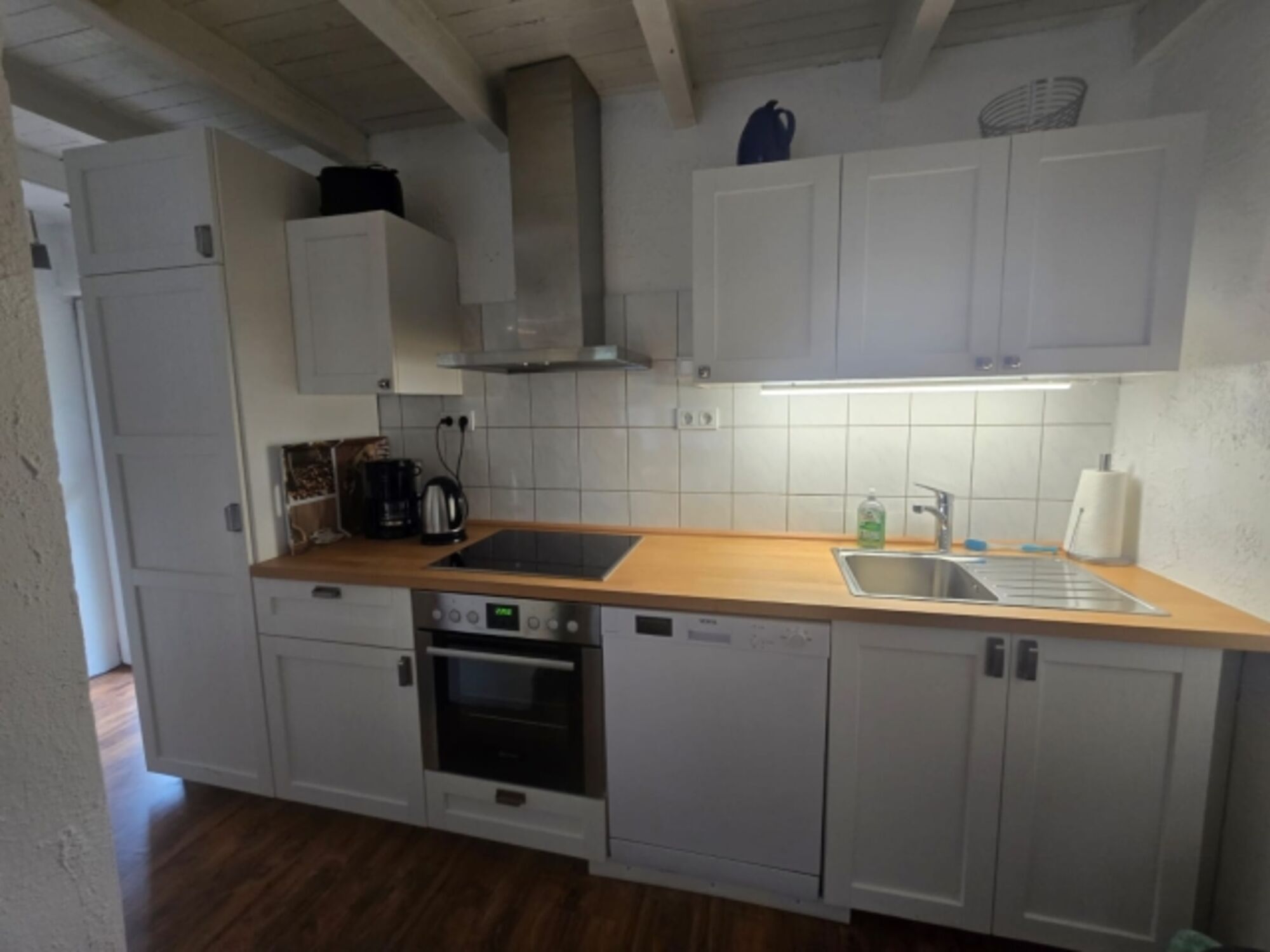 4-Platten Herd, Dunstabzugshaube, Kühlschrank mit Gefrierfach, Korkenzieher / Flaschenöffner, Gewürze (Salz, Pfeffer, Zucker), Geschirrhandtücher, Mülltüten