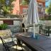 Hof mit Grill, Tisch und Stühle, Sonnenschirm