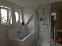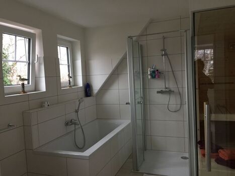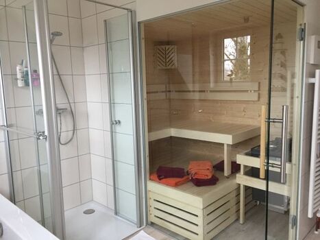 Eine weitere Annehmlichkeit für die Zweibeiner ist die -in das Bad im Obergeschoss- integrierte Sauna mit der Option finnisches Saunieren oder Biosauna.