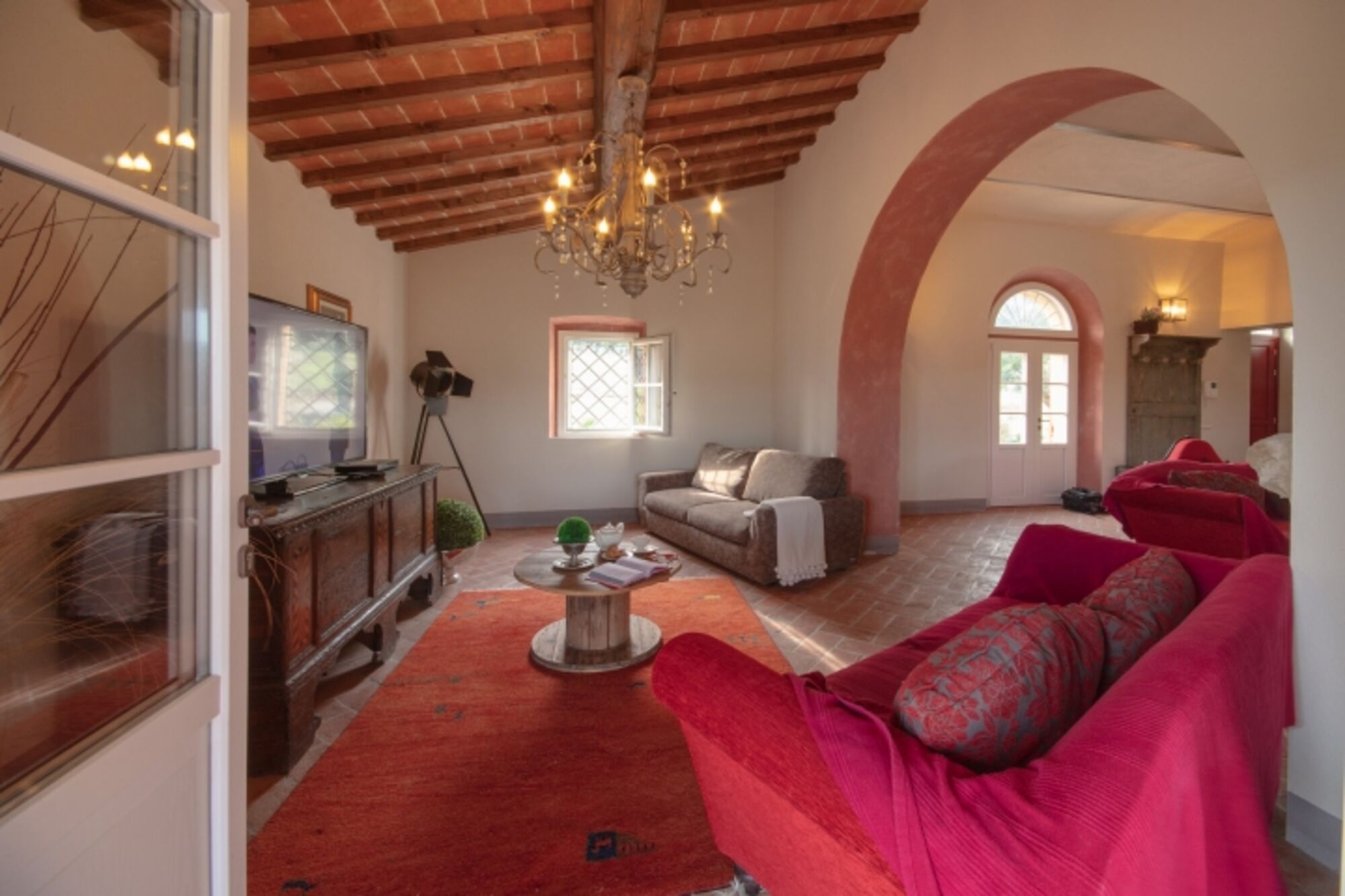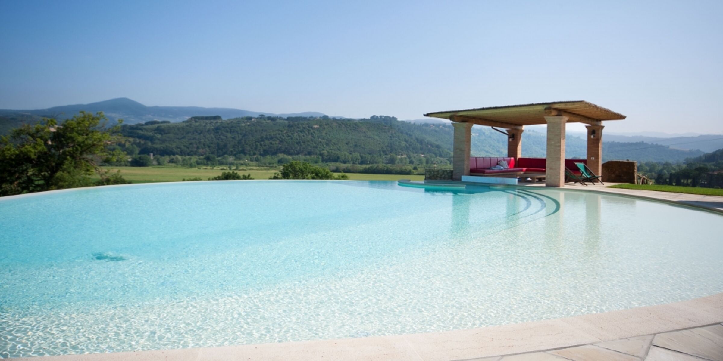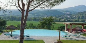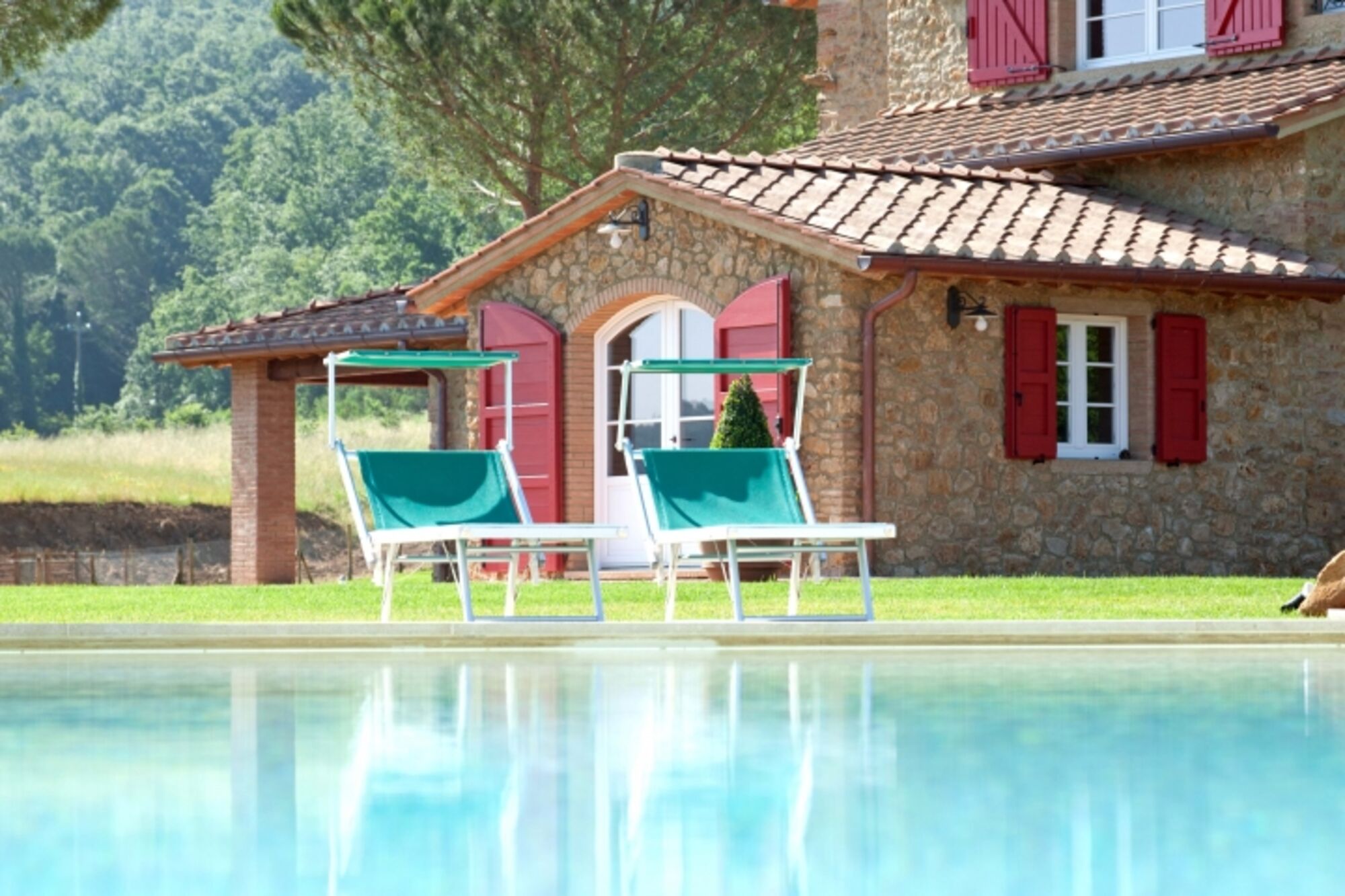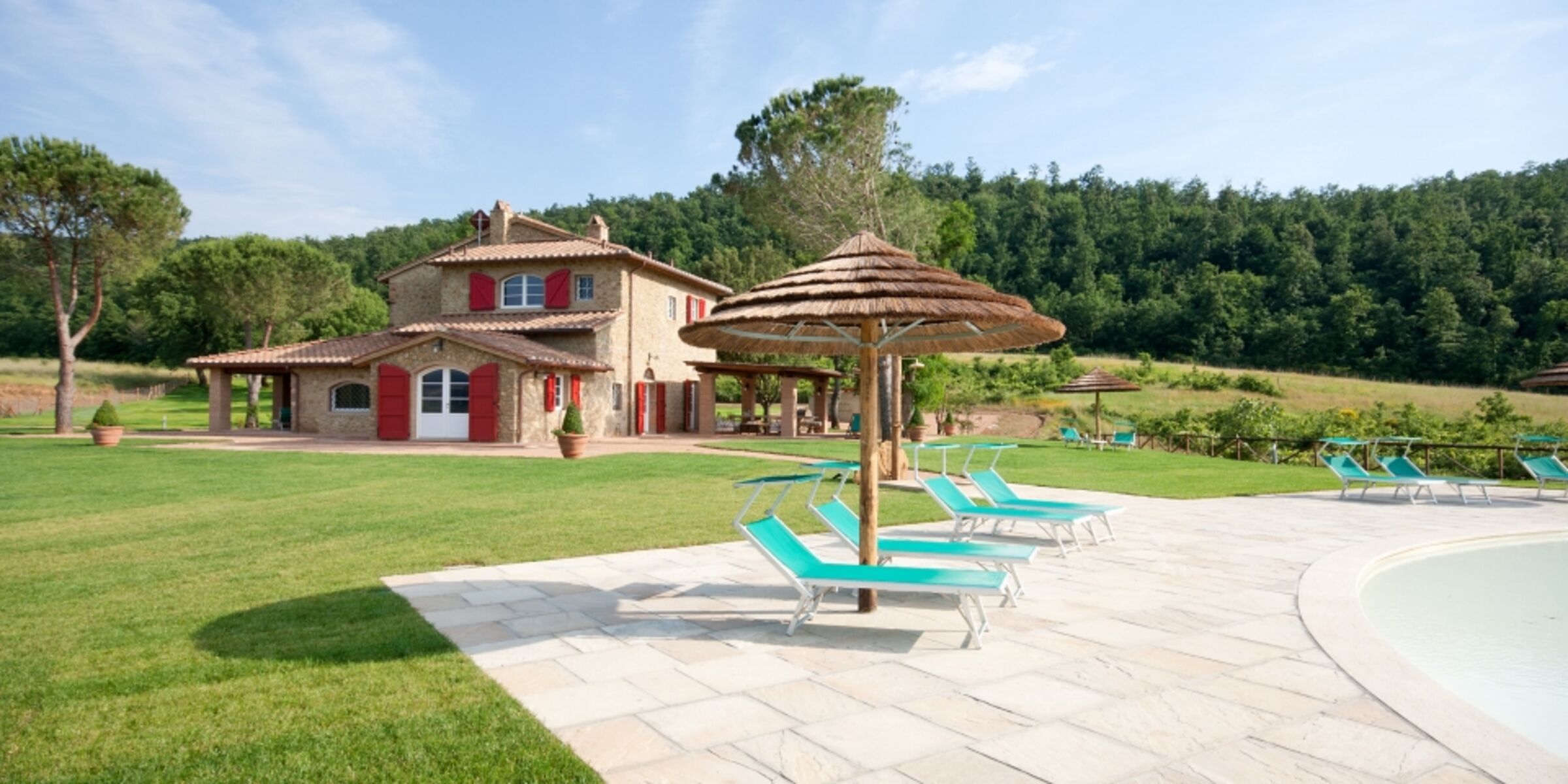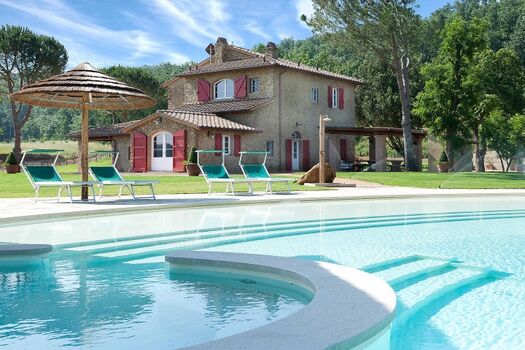 Es ist uns eine große Freude, unser Podere Fonteinfrancia vorzustellen. Die Natursteinfassade, der geräumige Innenbereich mit Backsteinenbögen, die großen Kamine von früher, der Tonfliesenfußboden und die Balkendecke glänzen wieder in alter Pracht. Der schöne 11000 m² große Park im Englischen Stil, der das Haus umgibt, ebenso wie das herrliche 20 x 18 m große Schwimmbecken mit Whirlpool für 10 Personen und sanft abfallenden Zugang bezeugen die Schönheit und Originalität des Ortes.