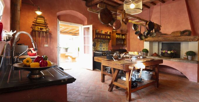 große voll ausgestattete Küche im toskanischen Stil Die Küche führt zur Pergola im Freien mit einem großen Tisch mit Baenken zum Essen im Freien und einer zweiten Außenküche mit Grill
