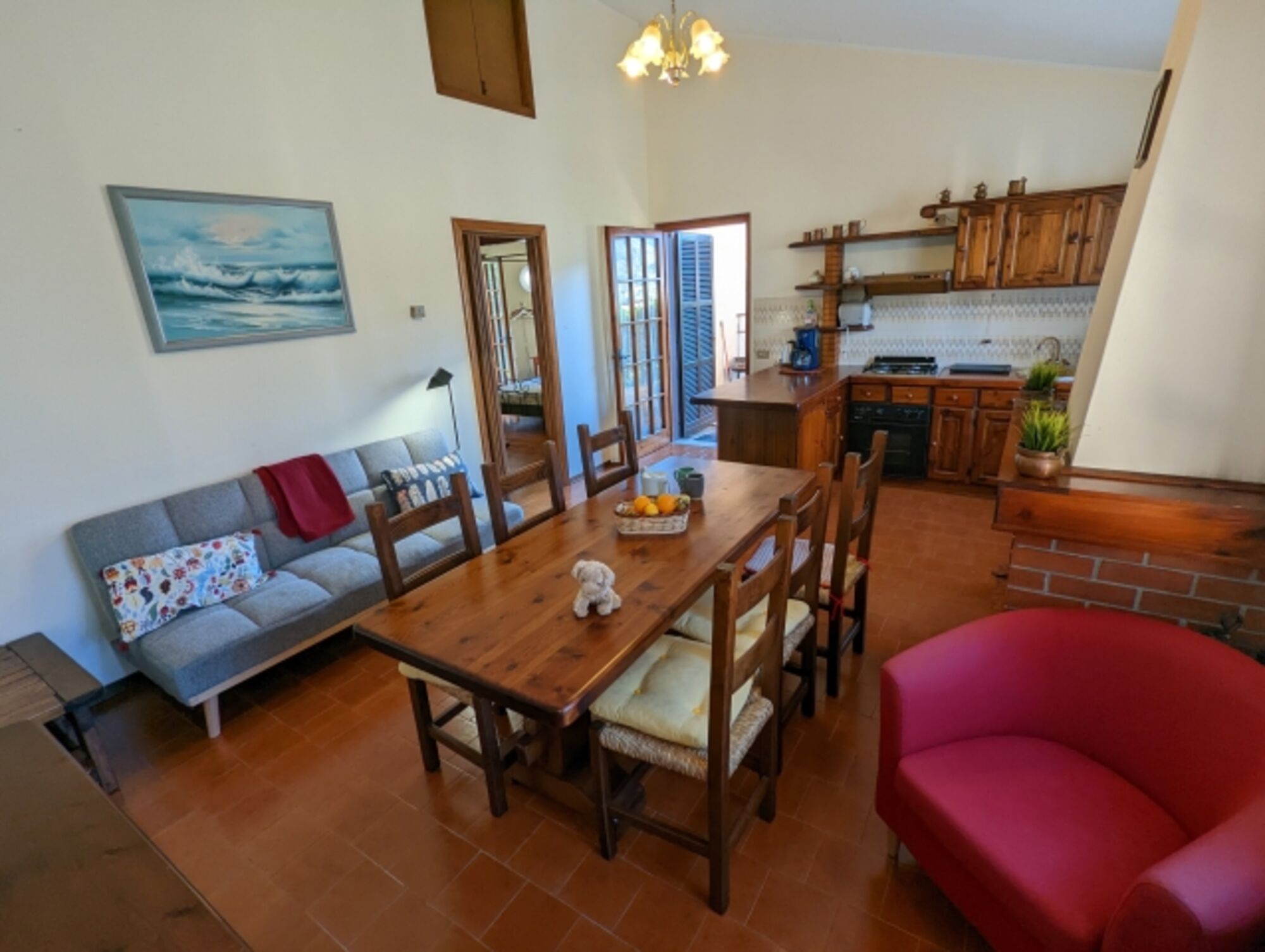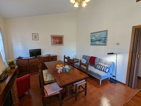 Wohnfläche ca. 70 qm. Wohn-Esszimmer mit integrierter Küche. Großer Esstisch, SAT-TV. Schlafsofa. Die Küche ist ausgestattet mit 4-Flammen-Gasherd, Backofen, Kaffeemaschine, Kühlschrank. Einfaches Badezimmer mit Dusche, WC, Waschmaschine, Waschbecken. 2 Schlafzimmer mit Doppelbett. Vom 2. Schlafzimmer gelangt man in den hinteren Garten. Zentralheizung. Möblierte Terrasse mit Gartenmöbeln, Sonnenschirm und Grill.