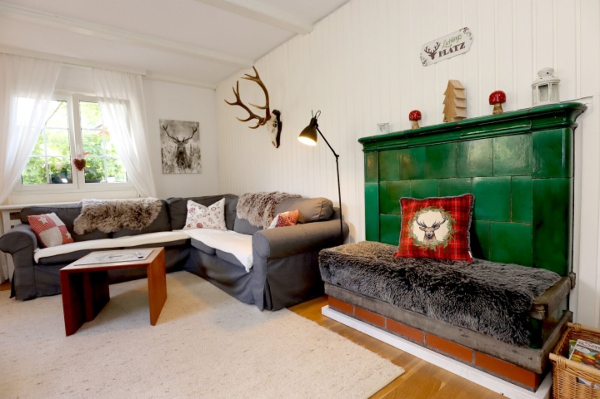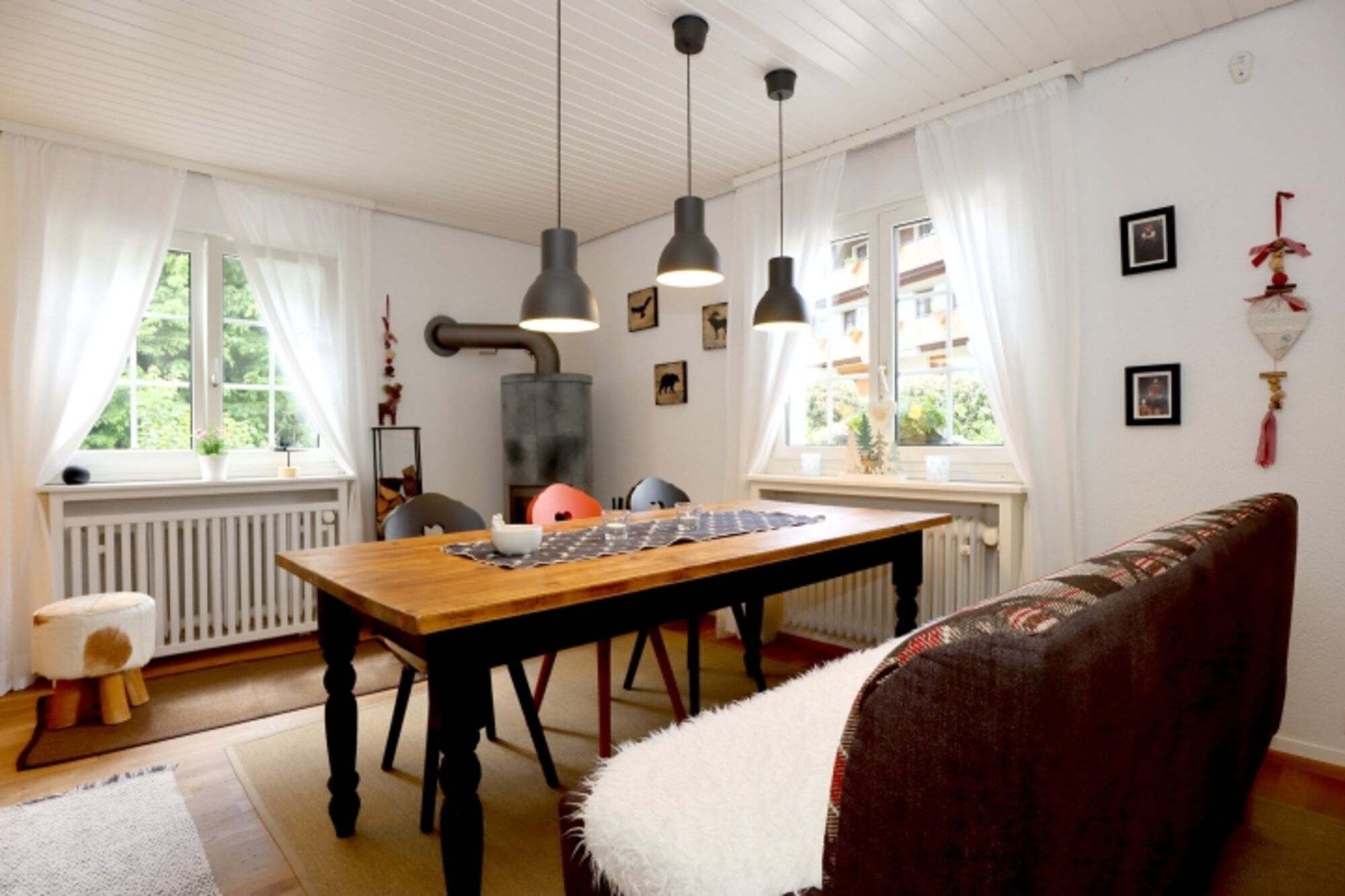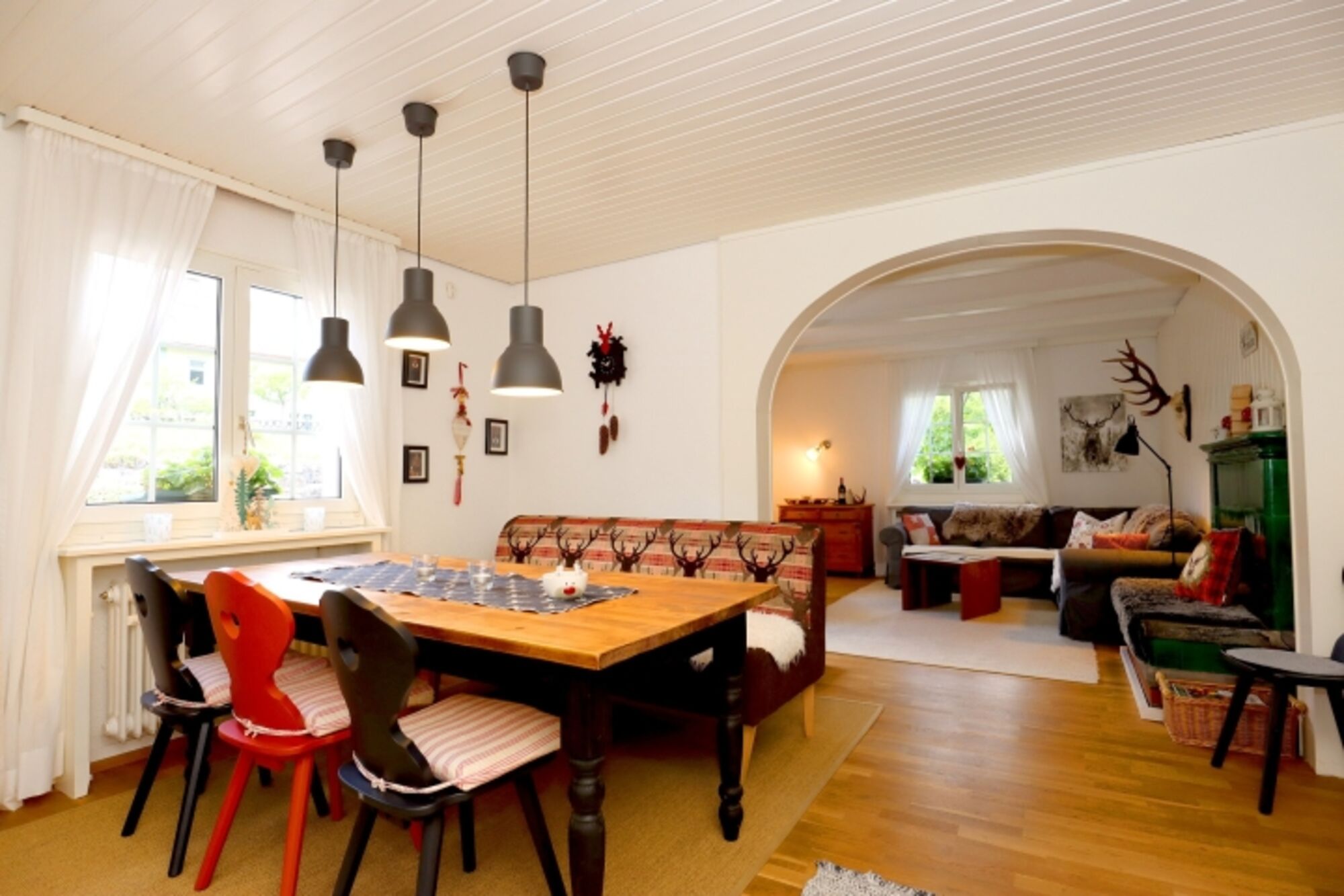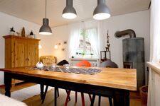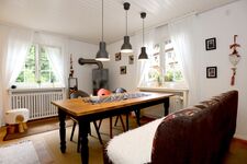 Sie betreten das Haus über eine Loggia und gelangen in den Eingangsbereich - Sie erkennen gleich - alt trift auf modern! Das helle grau der Fließen in der Diele fügt sich hervorragend in den Baustiel des Hauses ein, ebenso die Wohnküche. Im Wohn- und Esszimmer ist ein Eichenparkettboden verlegt, der extravagante Kachelofen (an Zentralheizung angeschlossen) bringt in der kalten Jahrszeit Gemütlichkeit herein.