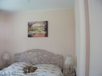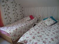 2 separate Einzelbetten je 1m x 2m. Gut geeignet als Kinderzimmer, da Kinderbücher. Einzelbett, Kommode, Spiegel, Leselampe am Bett