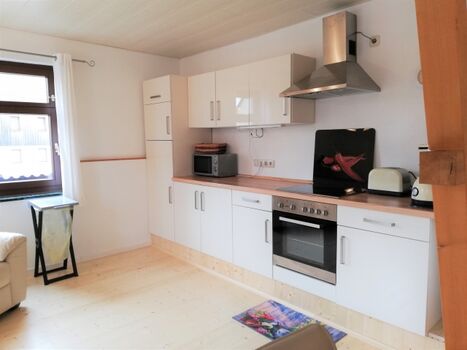 Cerankochfeld, Dunstabzugshaube, Kühlschrank mit Gefrierfach, Eierkocher, Korkenzieher / Flaschenöffner, Gewürze (Salz, Pfeffer, Zucker), Geschirrhandtücher, Mülltüten, Essplatz in der Küche, TV in der Küche