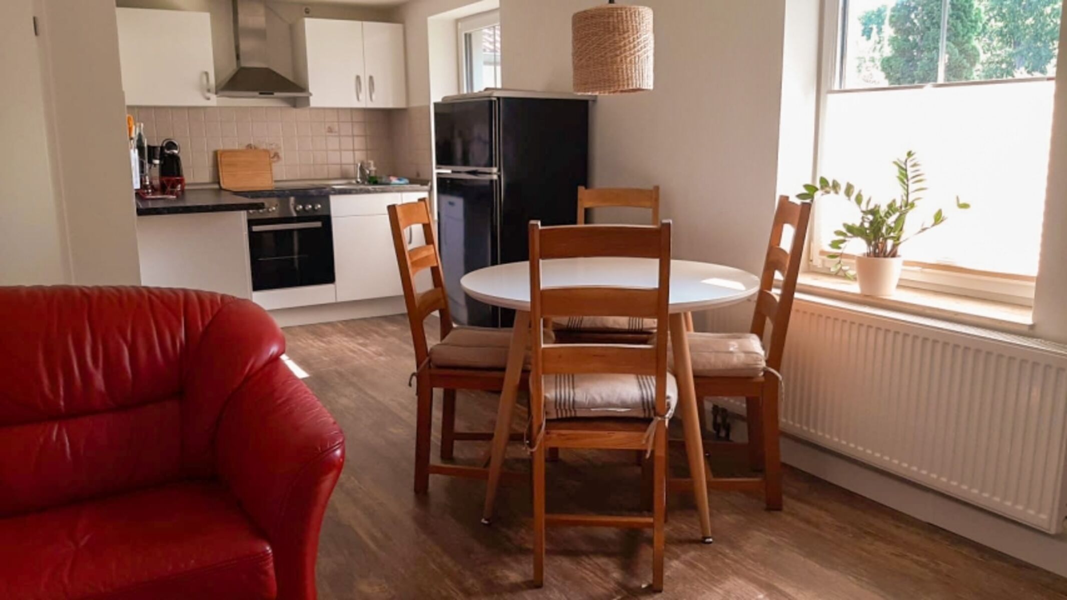 4-Platten Herd, Kühlschrank mit Gefrierfach, Korkenzieher / Flaschenöffner, Gewürze (Salz, Pfeffer, Zucker), Öl / Essig, Geschirrhandtücher, Mülltüten, Essplatz in der Küche