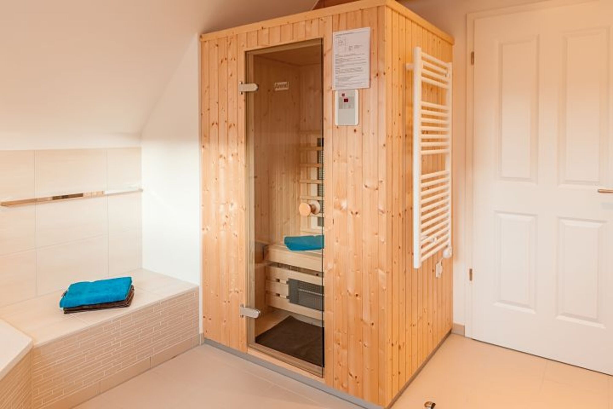 Im Obergeschoss befindet sich ein weiteres großes Schlafzimmer mit Doppelbett und Flat TV. Das sehr großzügige Badezimmer im Obergeschoss ist im Gegensatz zum Bad im Erdgeschoss mit einer Badewanne und zusätzlich mit einer Infrarotkabine ausgestattet.