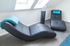 In der angrenzenden Galerie laden Relax-Liegen z. B. bei Kerzenlicht oder mit einem guten Buch zum Entspannen ein. Ein besonderes architektonisches Highlight im Obergeschoss sind die sichtbaren Balken, welche ein besonderes Raumgefühl geben.