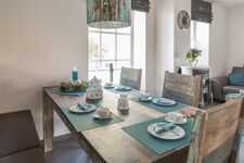 Es wurde mit viel Liebe zum Detail eingerichtet. Der lichtdurchflutete Wohn- und Essbereich im Erdgeschoss ist zusätzlich zur Fußbodenheizung mit einem stilvollem Kaminofen ausgestattet und lädt zur jeder Jahreszeit zum Verweilen ein. Die direkt an den Essbereich angrenzende offene moderne Einbauküche lässt durch ihre großzügige Ausstattung keine Wünsche offen.