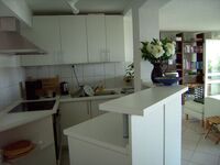 In der Einbauküche mit Frühstückstheke ist alles vorhanden, von reichlich Geschirr über Gläser und Besteck, Kochgeschirr und Zubehör, Kaffee- und Espressomaschine, Wasserkocher. Der Einbauherd hat ein 4 Platten Ceranfeld und ein Backrohr. Im Abstellraum lagern die Liegestühle, Sonnenschirme, Strandmatten, Badetasche usw. Sie bekommen wöchentlich frische Bettwäsche, Handtücher, Strandlaken, Geschirrtücher und Tischwäsche.