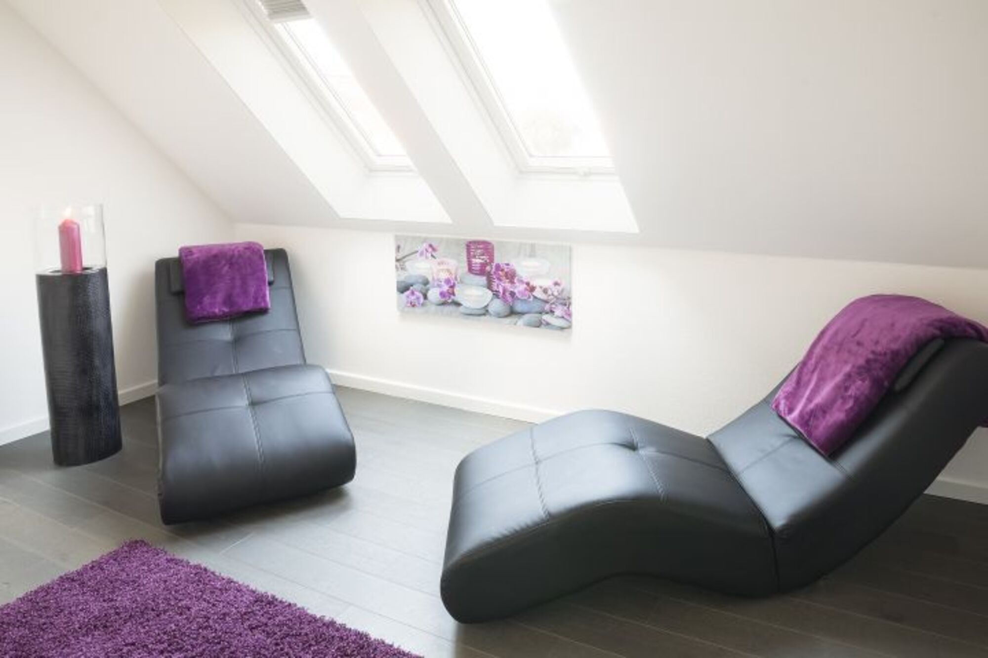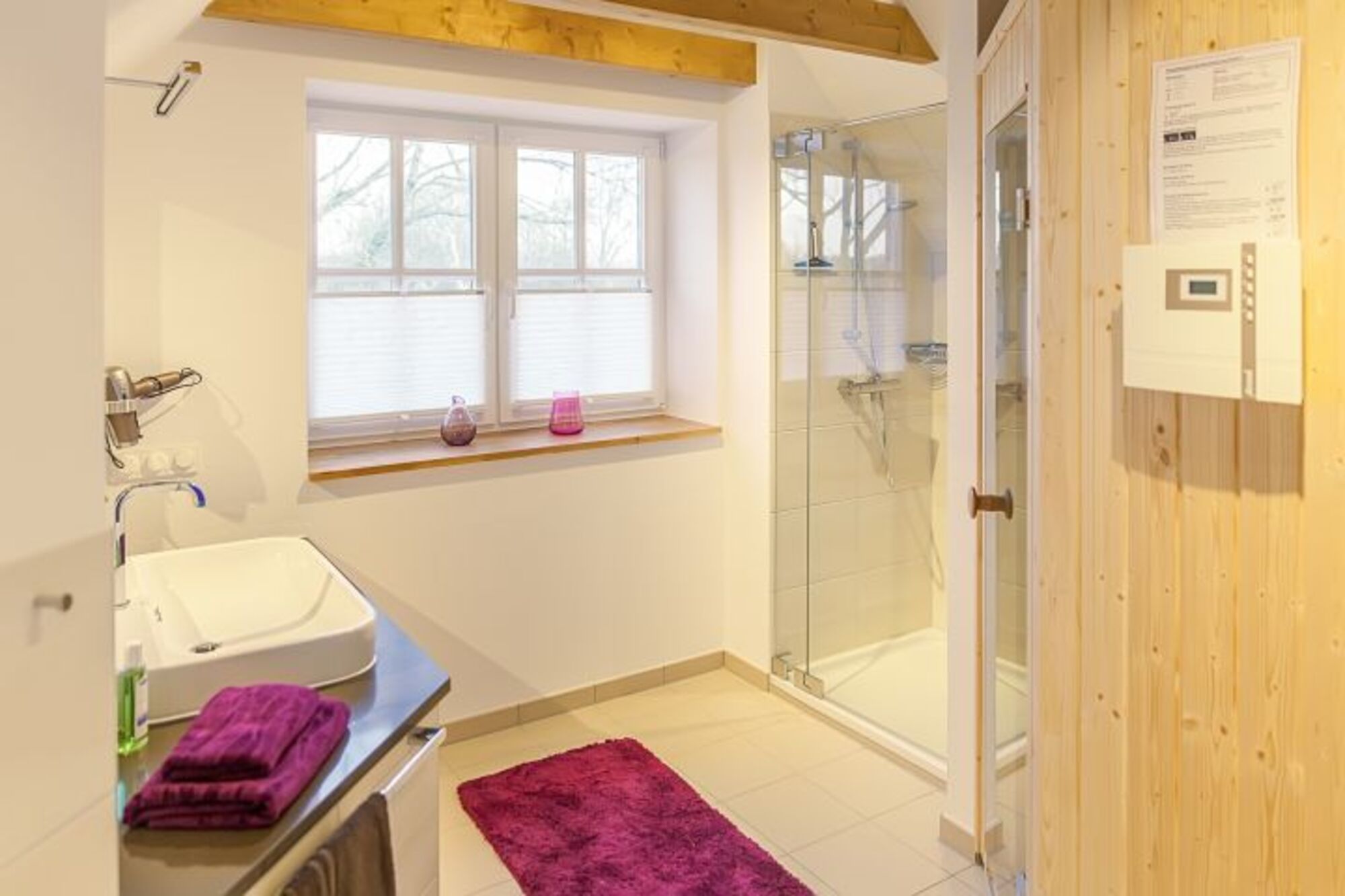 Im Obergeschoss befindet sich das Hauptschlafzimmer mit Doppelbett und Flat TV. Im großzügigen Hauptbadezimmer lädt eine finnische Sauna und eine Regendusche zum Entspannen ein. Anschließend können Sie im Galeriebereich auf einer Relaxliege bei Kerzenlicht ein gutes Buch lesen oder einfach nur die Ruhe genießen. Ein besonderes architektonisches Highlight im Obergeschoss sind die sichtbaren Balken, welche ein besonderes Raumgefühl geben.