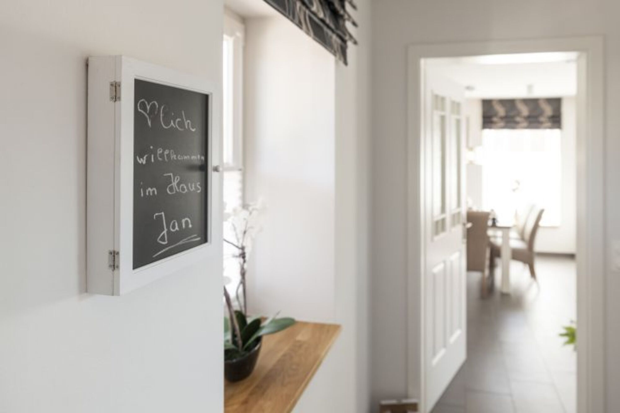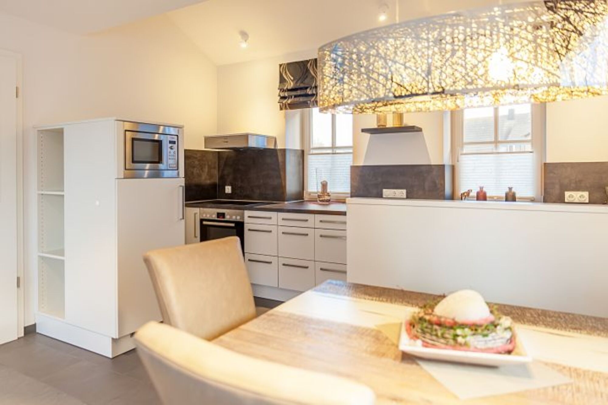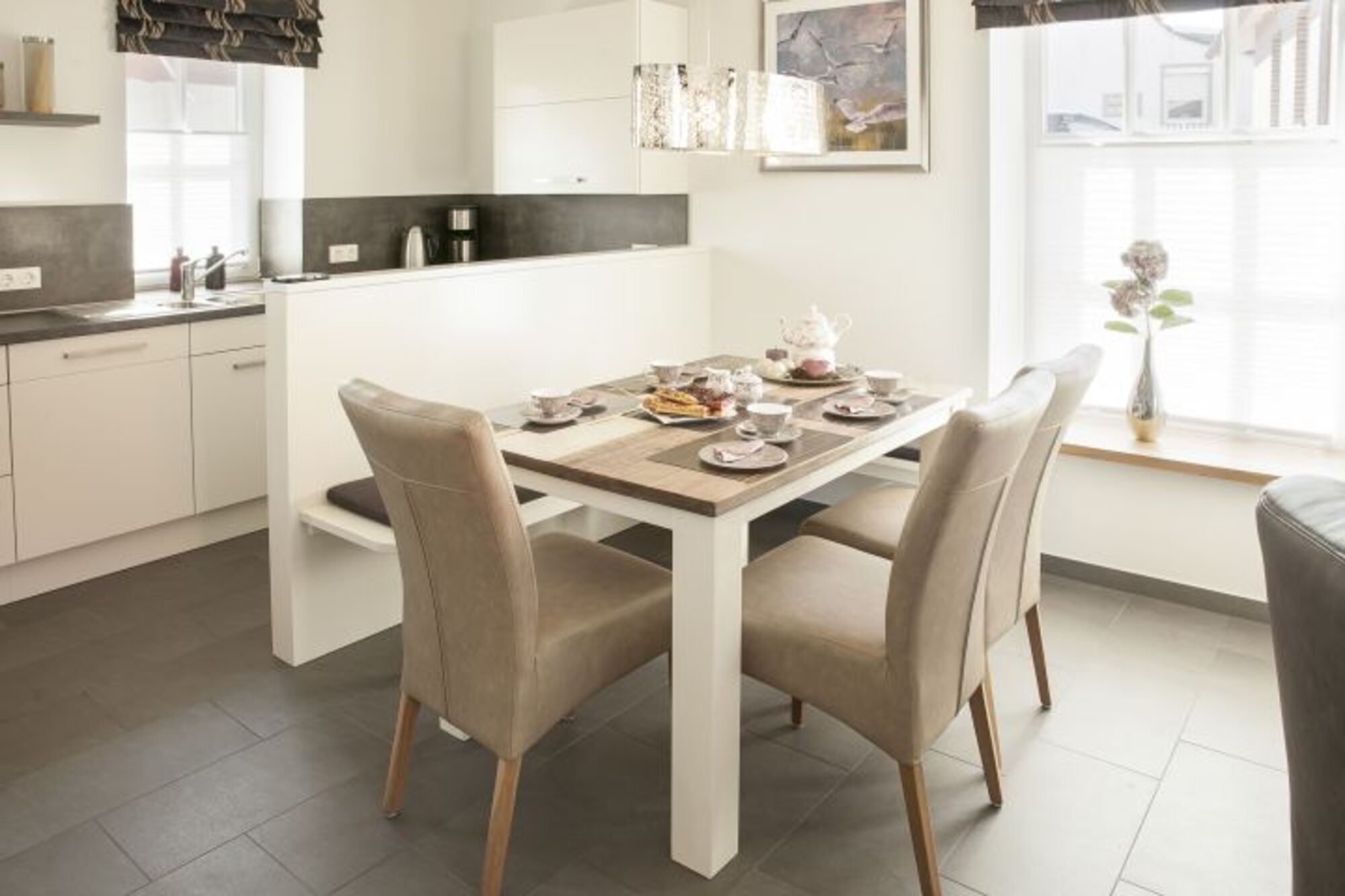 Für das Haus Jan wurden aktuelle Schlamm- und Brauntöne gewählt. Eine liebevolle Dekoration unterstützt das besondere Ambiente dieses Hauses. Im lichtdurchfluteten Wohnbereich mit schwenkbaren Flat TV fühlt man sich auf Anhieb wohl. Eine große moderne Einbauküche mit angrenzendem Essbereich bietet sich zum gemeinsamen Kochen und Klönen an.