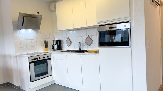 4-Platten Herd, Cerankochfeld, Dunstabzugshaube, Kühlschrank mit Gefrierfach, Mixer, Korkenzieher / Flaschenöffner, Mülltüten