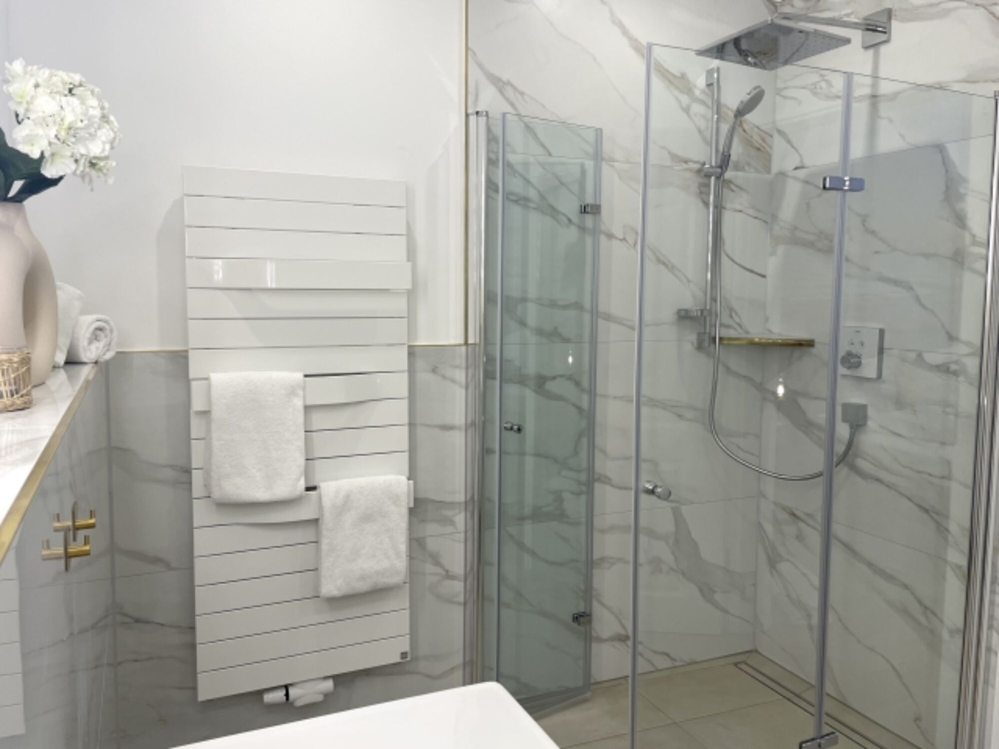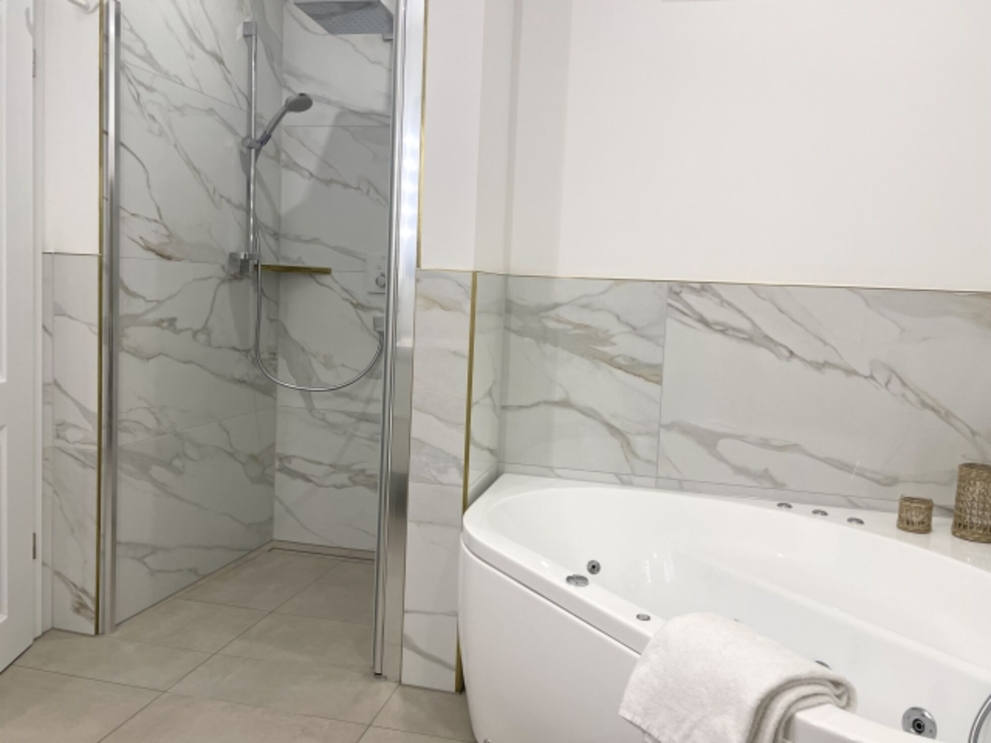 Ein Highlight der Wohnung ist die großzügige Wellness-Ausstattung: Gönnen Sie sich eine wohltuende Auszeit in Ihrer eigenen Sauna oder genießen Sie entspannende Stunden im Whirlpool. Für Ihre täglichen Bedürfnisse stehen Ihnen zwei moderne Badezimmer mit bodengleicher Dusche, Badewanne und Haartrockner zur Verfügung.