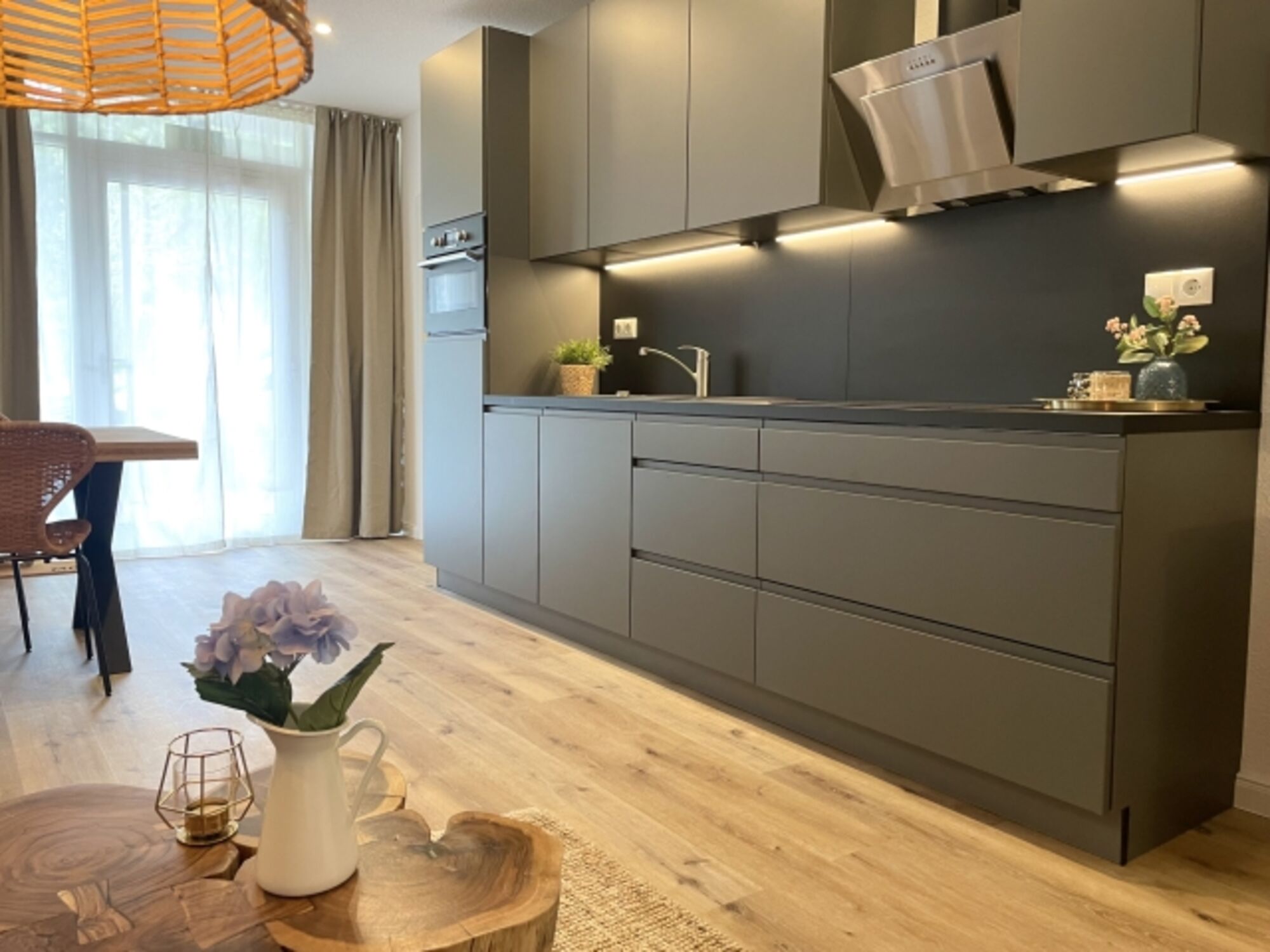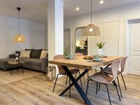 Die stilvoll eingerichtete Wohnung verfügt über zwei gemütliche Schlafzimmer, die mit hochwertigen Betten ausgestattet sind und für erholsame Nächte sorgen. Das gemütliche Schlafsofa im Wohnzimmer lädt zum Entspannen ein – vielleicht mit einem guten Buch oder einem gemütlichen Filmabend, denn die Wohnung ist mit drei Fernsehern und WLAN ausgestattet. Für gesellige Abendessen steht Ihnen ein Essbereich zur Verfügung, der nahtlos in die offene, voll ausgestattete Küche übergeht. Diese bietet alles, was Sie für die Zubereitung Ihrer Lieblingsgerichte benötigen: von einem Herd über eine Spülmaschine bis hin zu Mikrowelle und Kaffeemaschine.