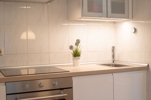 4-Platten Herd, Dunstabzugshaube, Kühlschrank mit Gefrierfach, Korkenzieher / Flaschenöffner, Mülltüten, Essplatz in der Küche