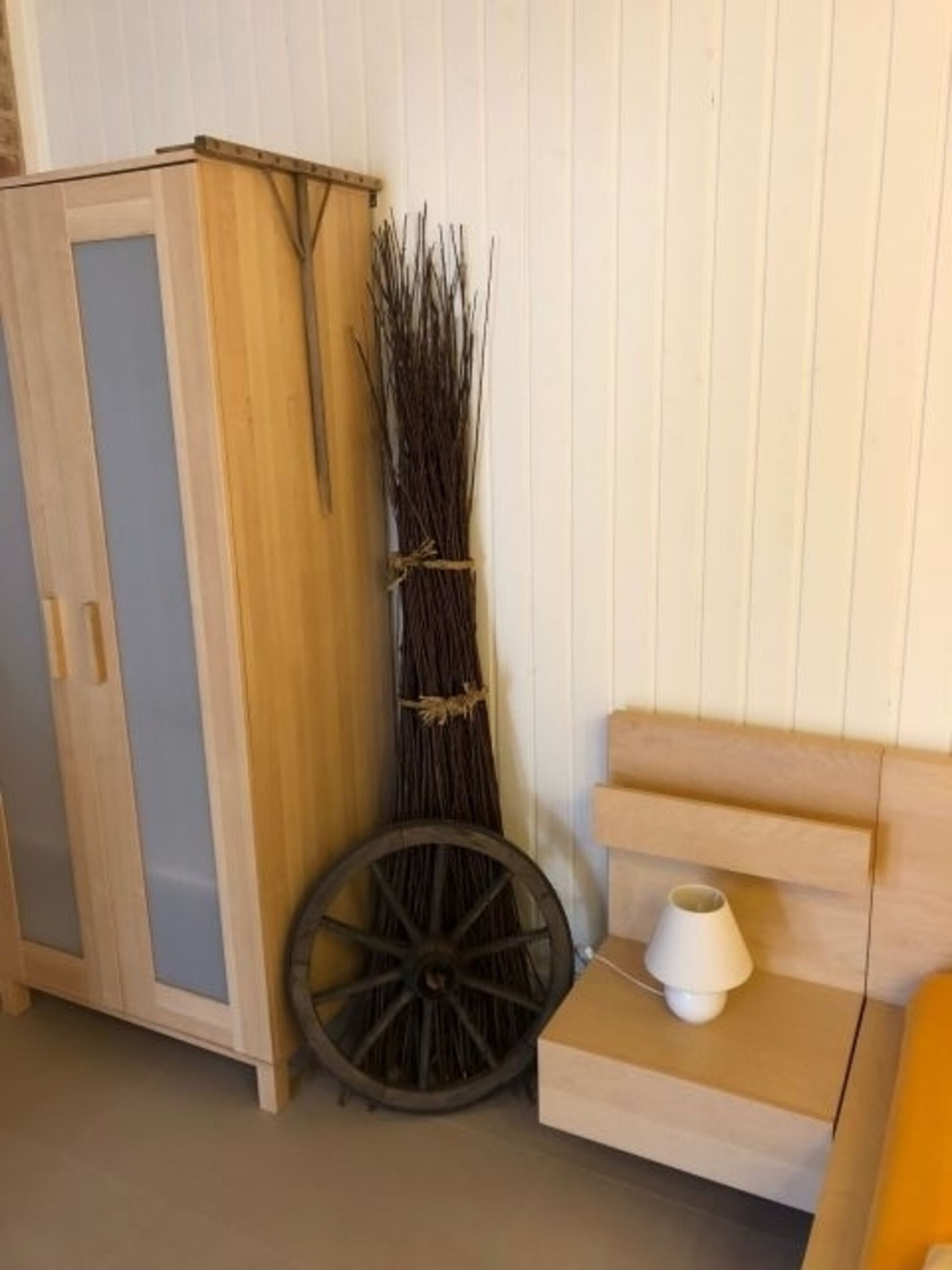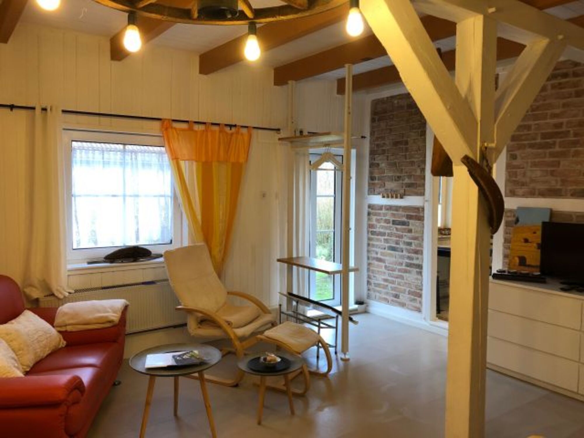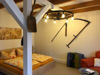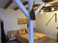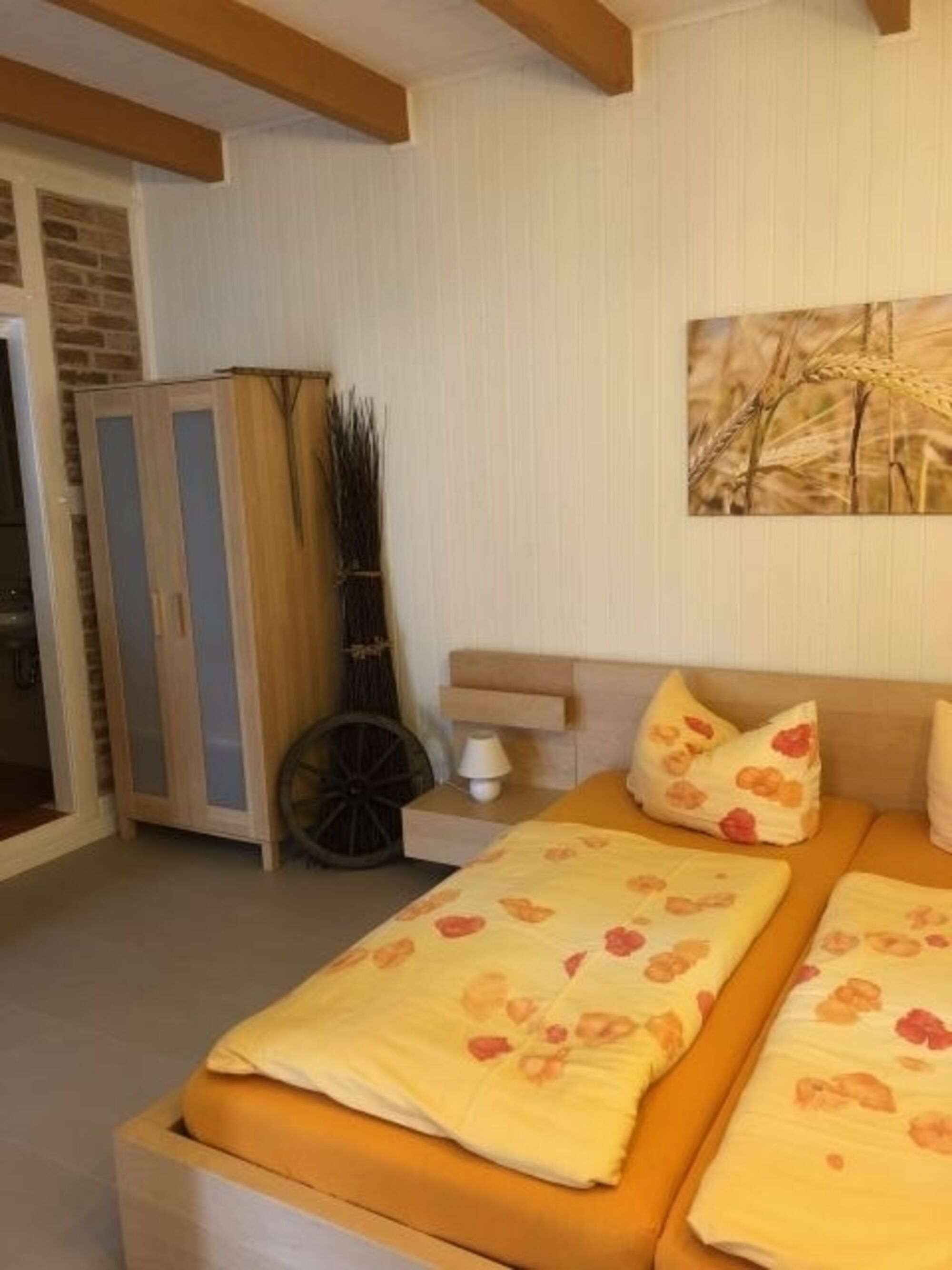 Die hier beschriebene Wohnung befindet sich im ausgebauten Teil der Scheune des ehemaligen Bauernhofes. Das wurde bei der Sanierung beachtet, so dass die Wohnung mit freigelegten Mauerwerk und Fachwerk den rustikalen, bäuerlichen Charakter beibehält. Die Wohnung hat einen kombinierten Wohn-/Schlafraum mit separater Küche mit Fenster und Bad mit Dusche.