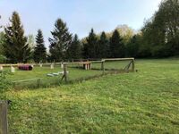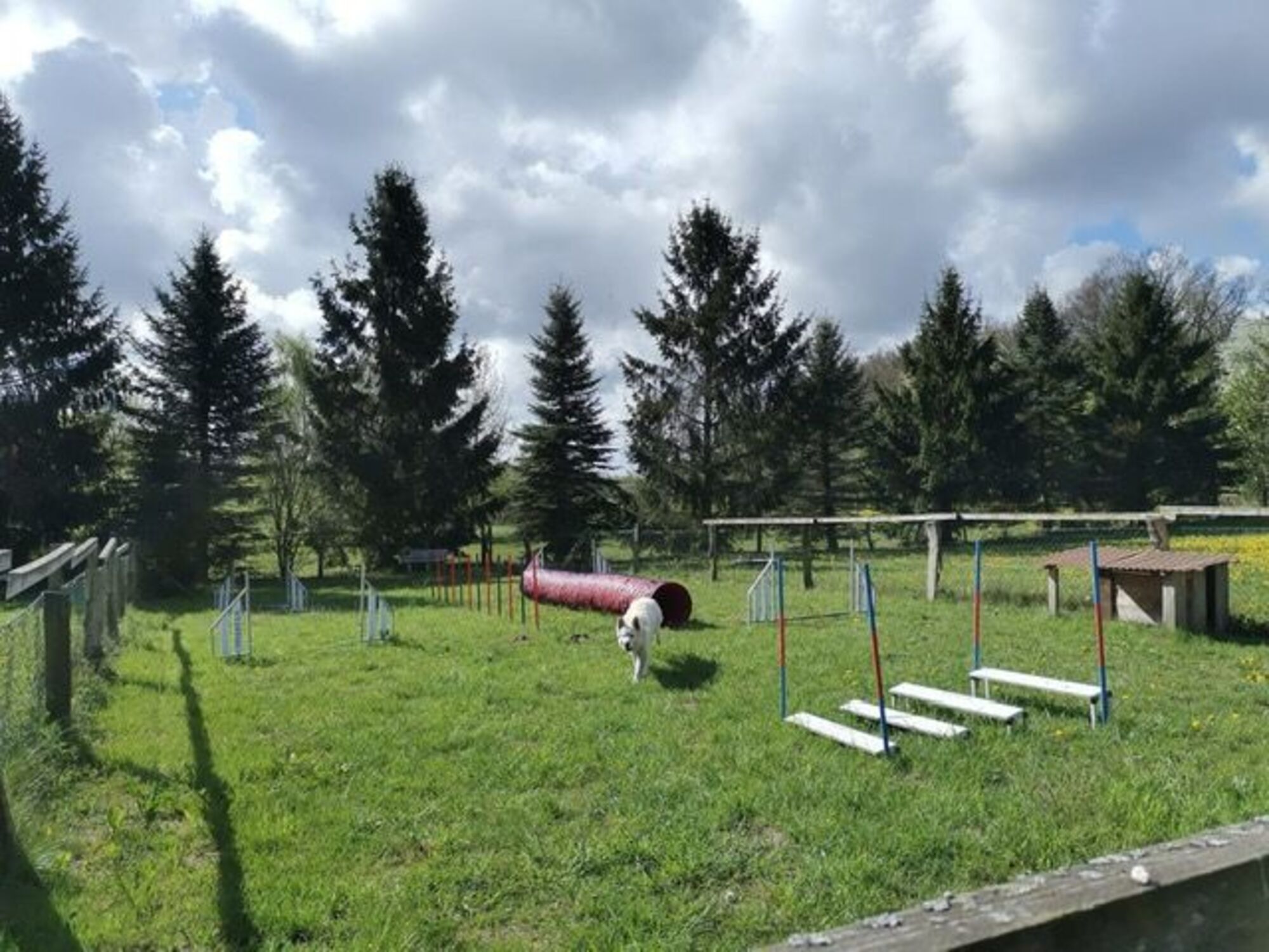 Es sind auch genügend Allgemeinflächen (13000 qm) vorhanden, um z.B. auch die Hunde miteinander spielen zu lassen oder Fährtenarbeit zu trainieren. Es gibt es auch noch einen separaten eingezäunten Übungsplatz mit verschiedenen Agility-Hindernissen, so dass Hundesportfreunde auch z.B. eine Übungslager veranstalten können. Zum Grundstück gehört auch ein kleiner Wald, in welchem z.B. Rettungshunde üben könnten. Für die zwingergewöhnten Hunde gibt es einen Zwinger 2x4 m groß, mit Hütte.