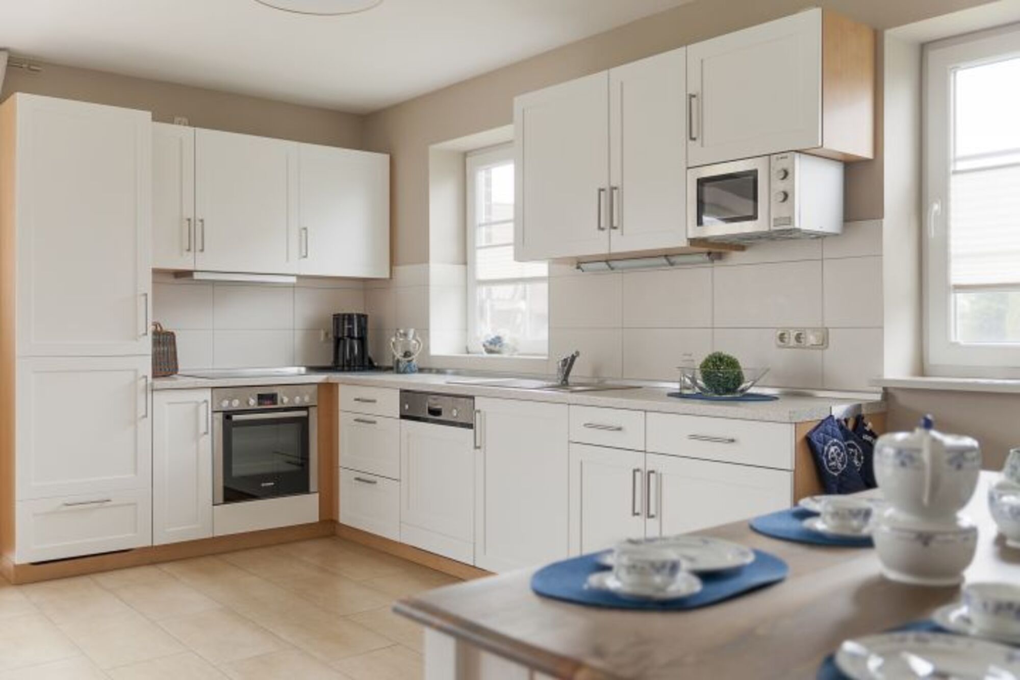 Cerankochfeld, Dunstabzugshaube, Kühlschrank mit Gefrierfach, Eierkocher, Korkenzieher / Flaschenöffner, Geschirrhandtücher, Essplatz in der Küche