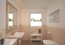 Neben einem Tageslicht-Badezimmer mit flacher Dusche, steht Ihnen auch ein Gäste-WC zur Verfügung. Die Ferienwohnung verfügt über 2 ruhige Schlafzimmer. In einem finden Sie ein bequemes Boxspring-Doppelbett (180 x 200 cm) und in dem Anderen 2 Boxspring-Einzelbetten (90 x 200 cm).
