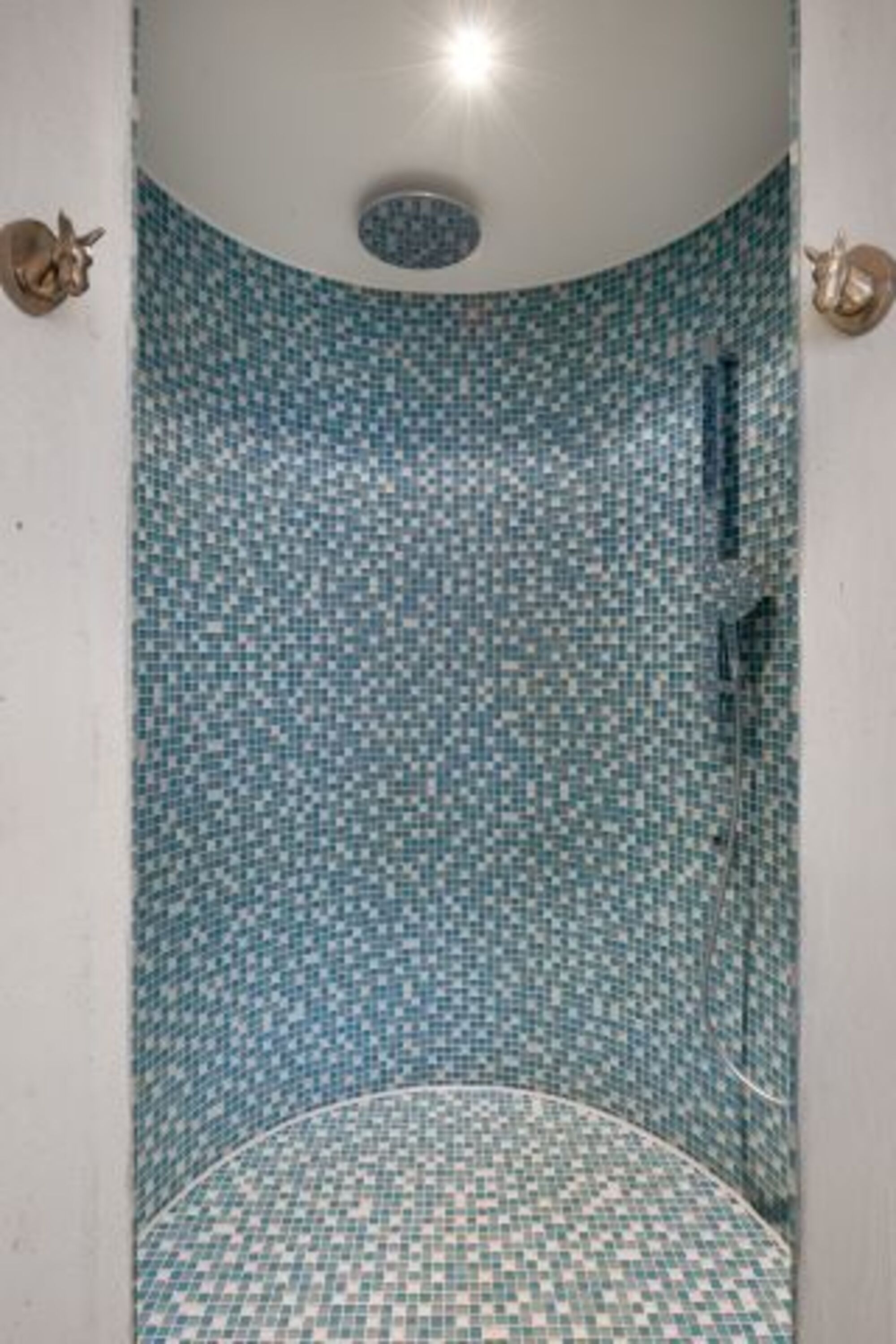 Großzügiges Bad in Hamam-Optik mit Runddusche Doppelwaschbecken, Regendusche, Spiegel, Fenster im Bad
