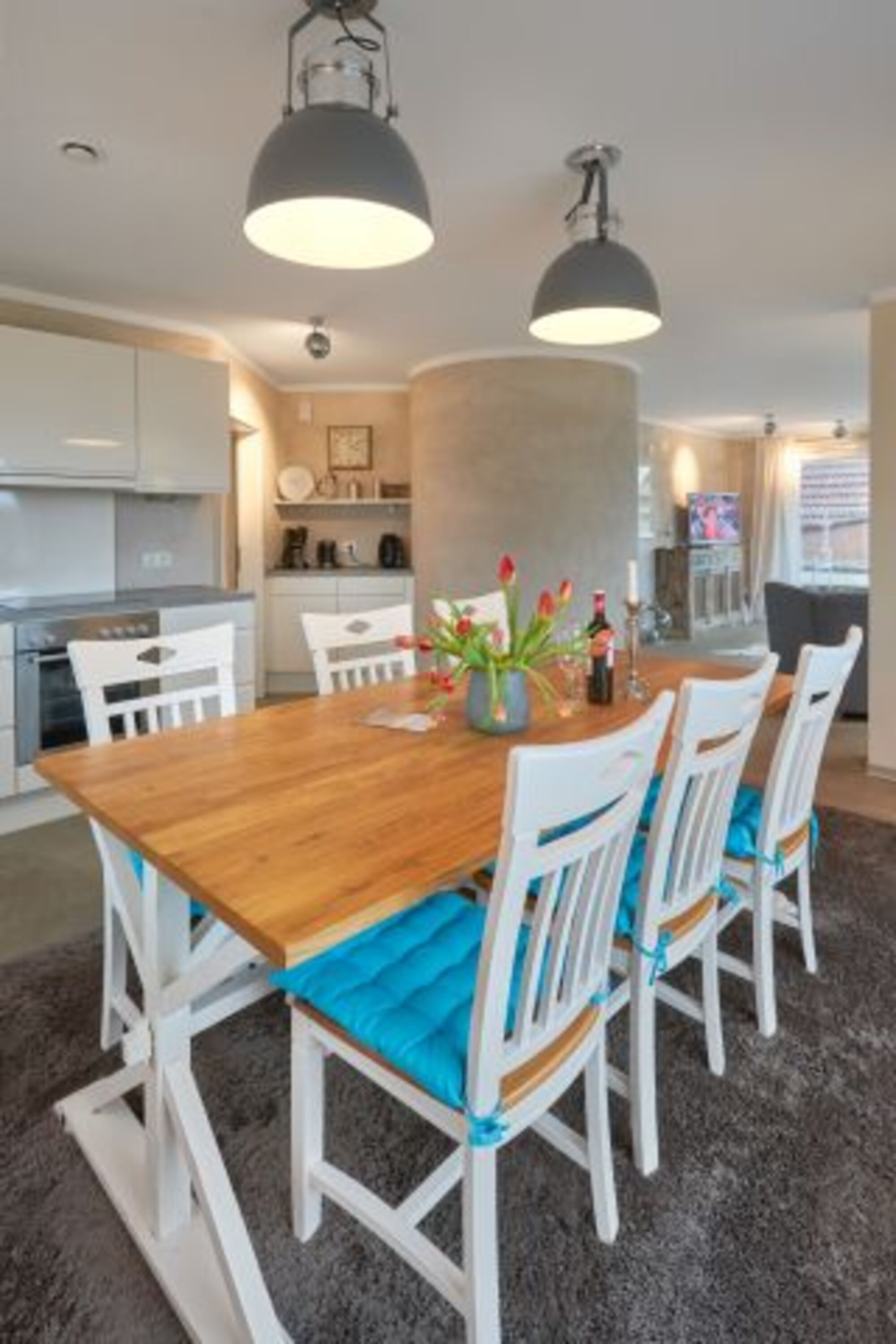 Cerankochfeld, Dunstabzugshaube, Kühlschrank mit Gefrierfach, Nespresso-Automat, Mixer, Korkenzieher / Flaschenöffner, Gewürze (Salz, Pfeffer, Zucker), Geschirrhandtücher, Essplatz in der Küche