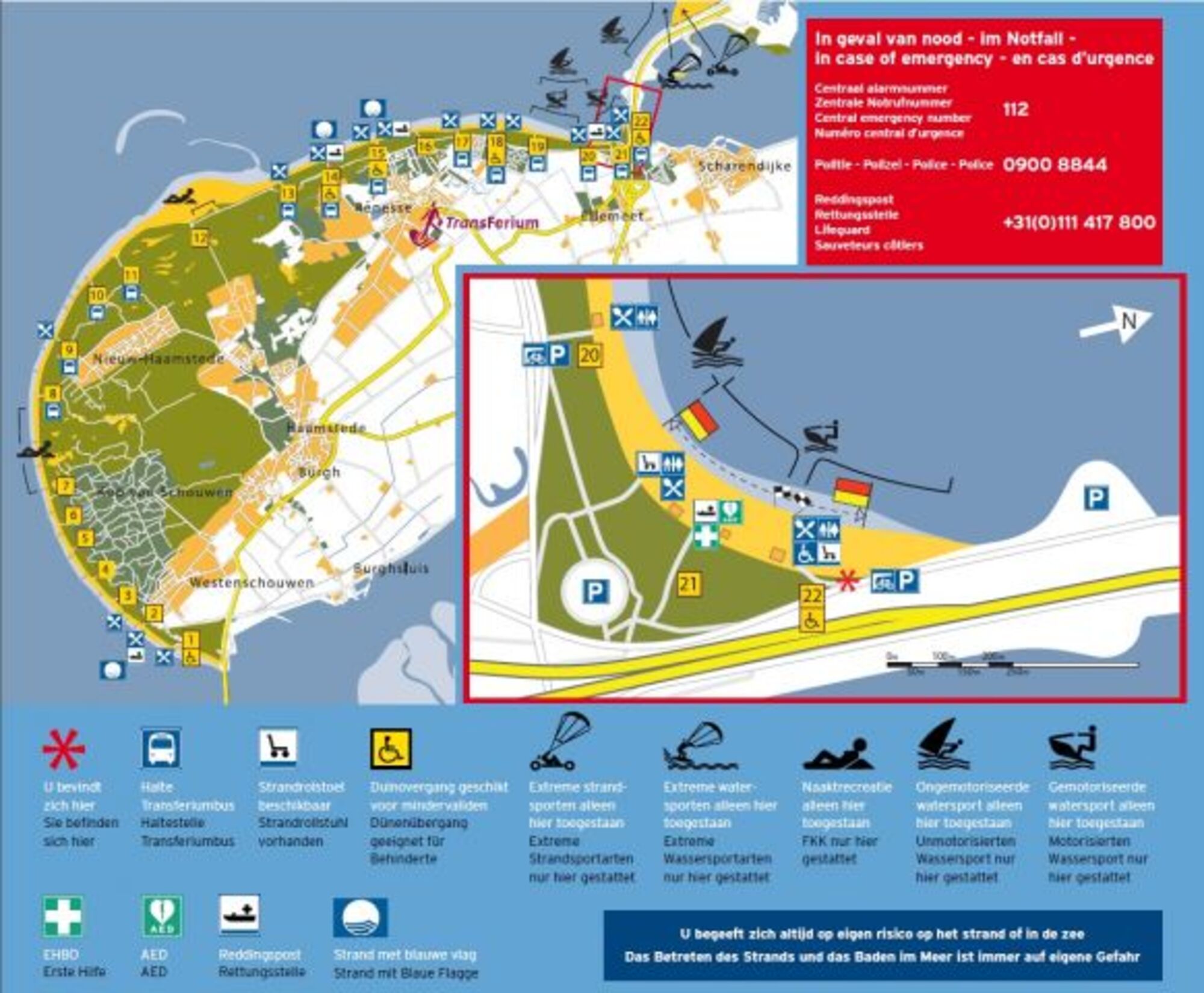 Wer will, kann in der Nordsee (3 km entfernt) und dem Grevelingermeer(500 m entfernt) fantastisch Wassersport betreiben. Mit dem Fahrrad erreicht man über Fahrradwege sowohl die Nordsee als auch das lebhafte Städtchen Renesse. Man kann an Renesse vorbei durch die Dünen auf schönen Muschelwegen bis Burgh-Haamstede und weiter durch das Oosterscheldekering, das Naturschutzgebiet Kwade Hoek bei Ouddorp, die Städtchen