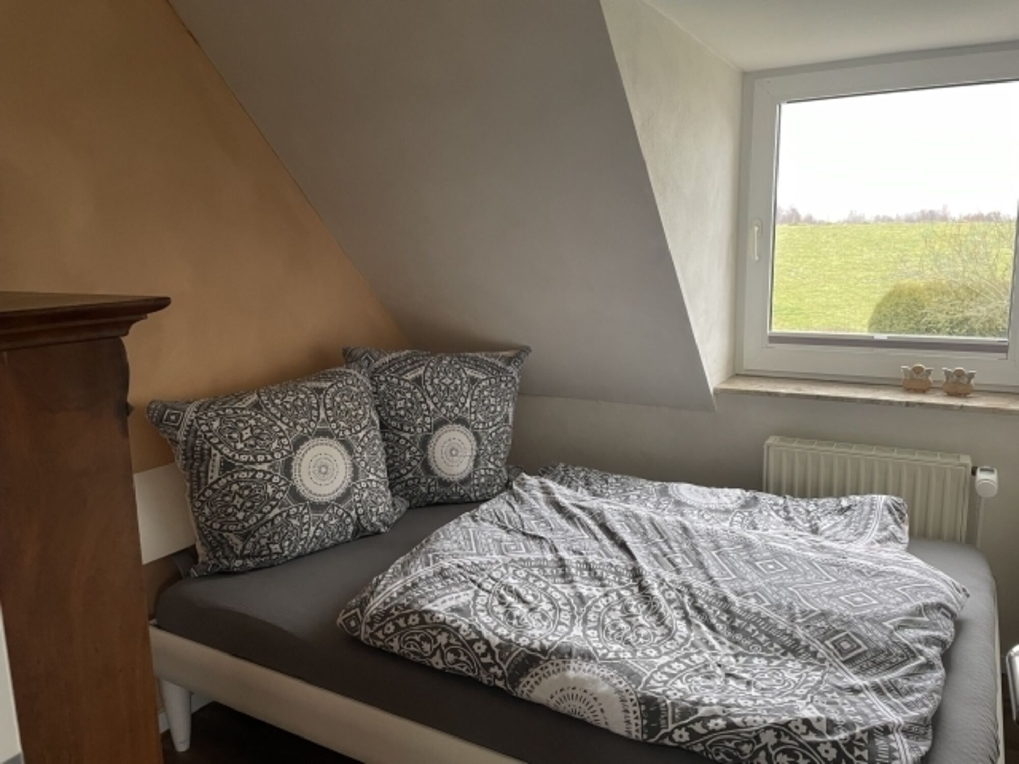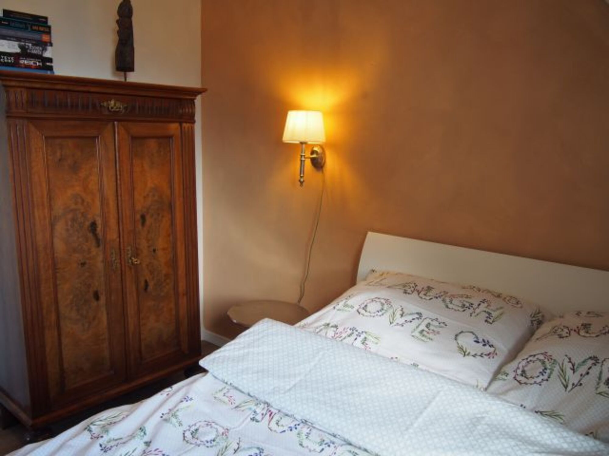 Auf Anfrage ist die Bettwäsche buchbar. Doppelbett 1,80 x 2,00m, Spiegel, Leselampe am Bett