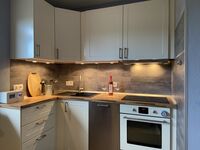 Cerankochfeld, Dunstabzugshaube, Kühlschrank mit Gefrierfach, Senseo-Kaffeeautomat, Nespresso-Automat, Tassimo-Kaffeautomat, Eierkocher, Mixer, Waffeleisen, Korkenzieher / Flaschenöffner, Gewürze (Salz, Pfeffer, Zucker), Essplatz in der Küche