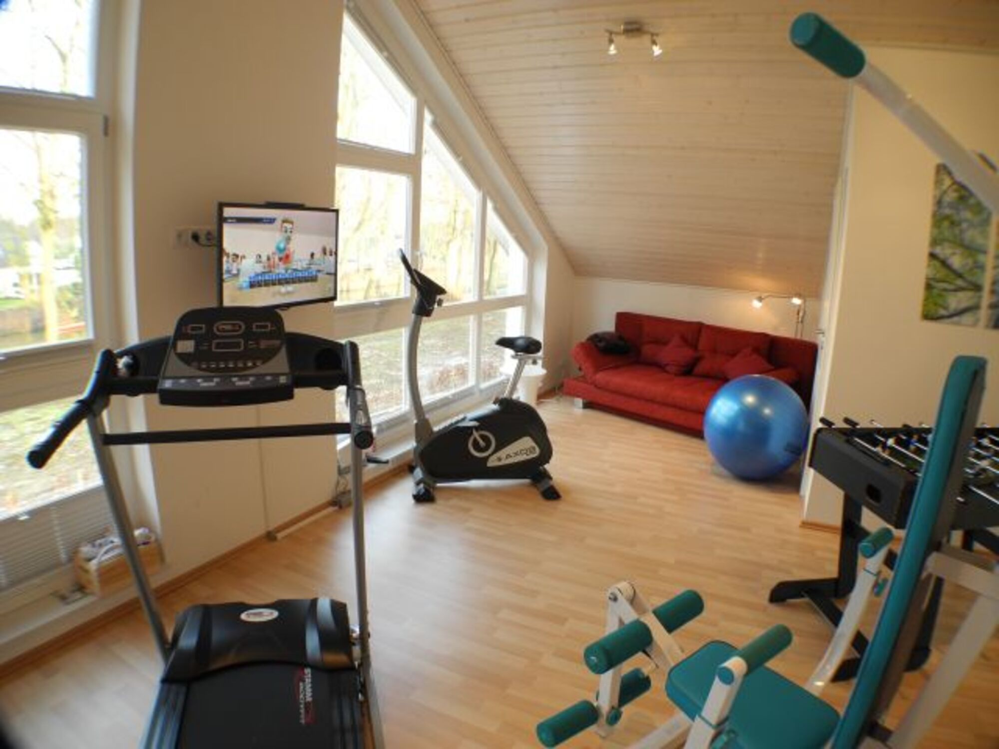 Die Schlafräume (Obergeschoss) sowie Fitnessraum und Wohnzimmer sind mit Fernsehern ausgestattet.