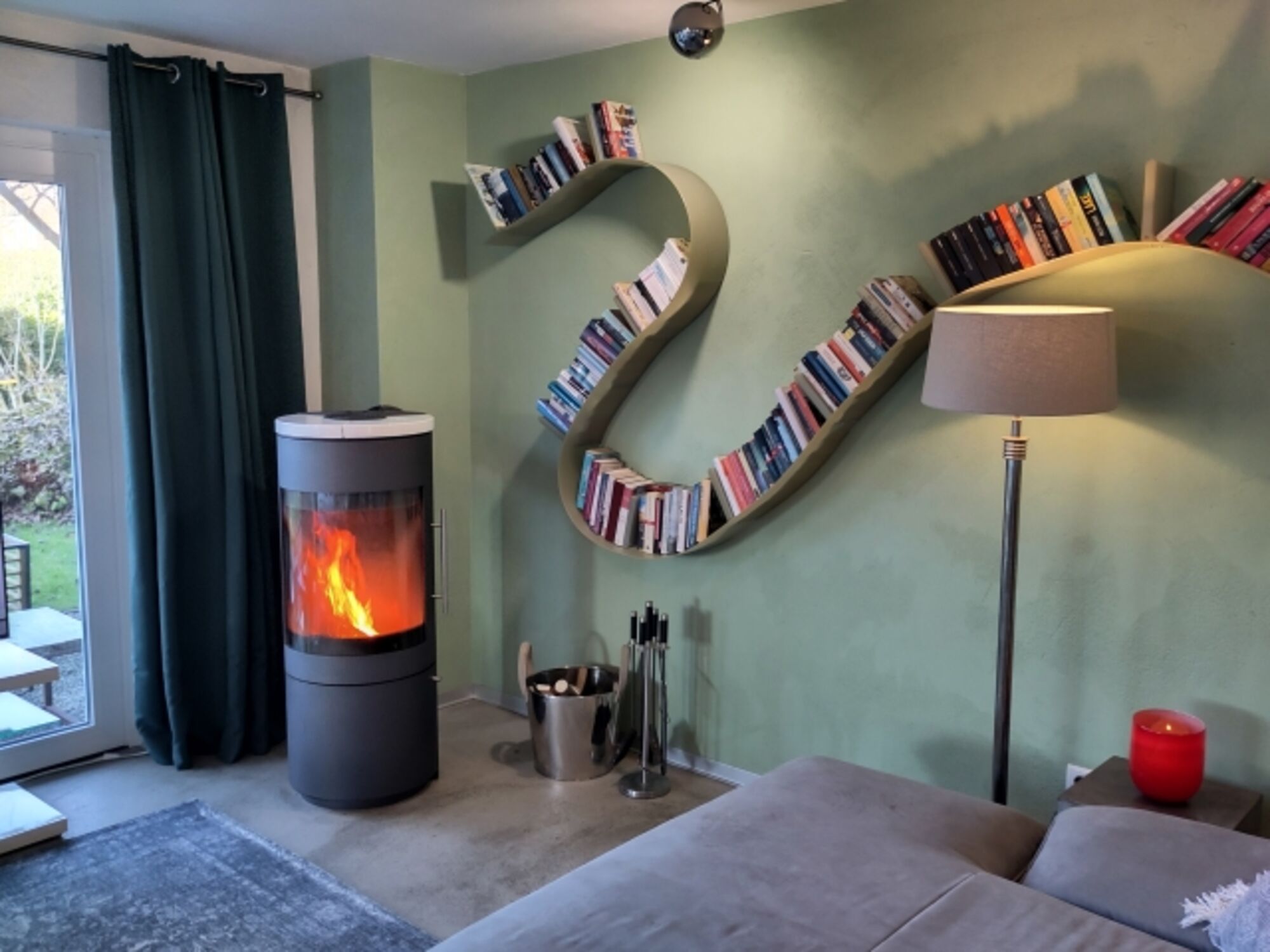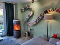 TV-Sat, HDTV Flachbildschirm, 3D-TV, Blu-Ray-Player, Bücher, Kaminofen, Eckcouch
