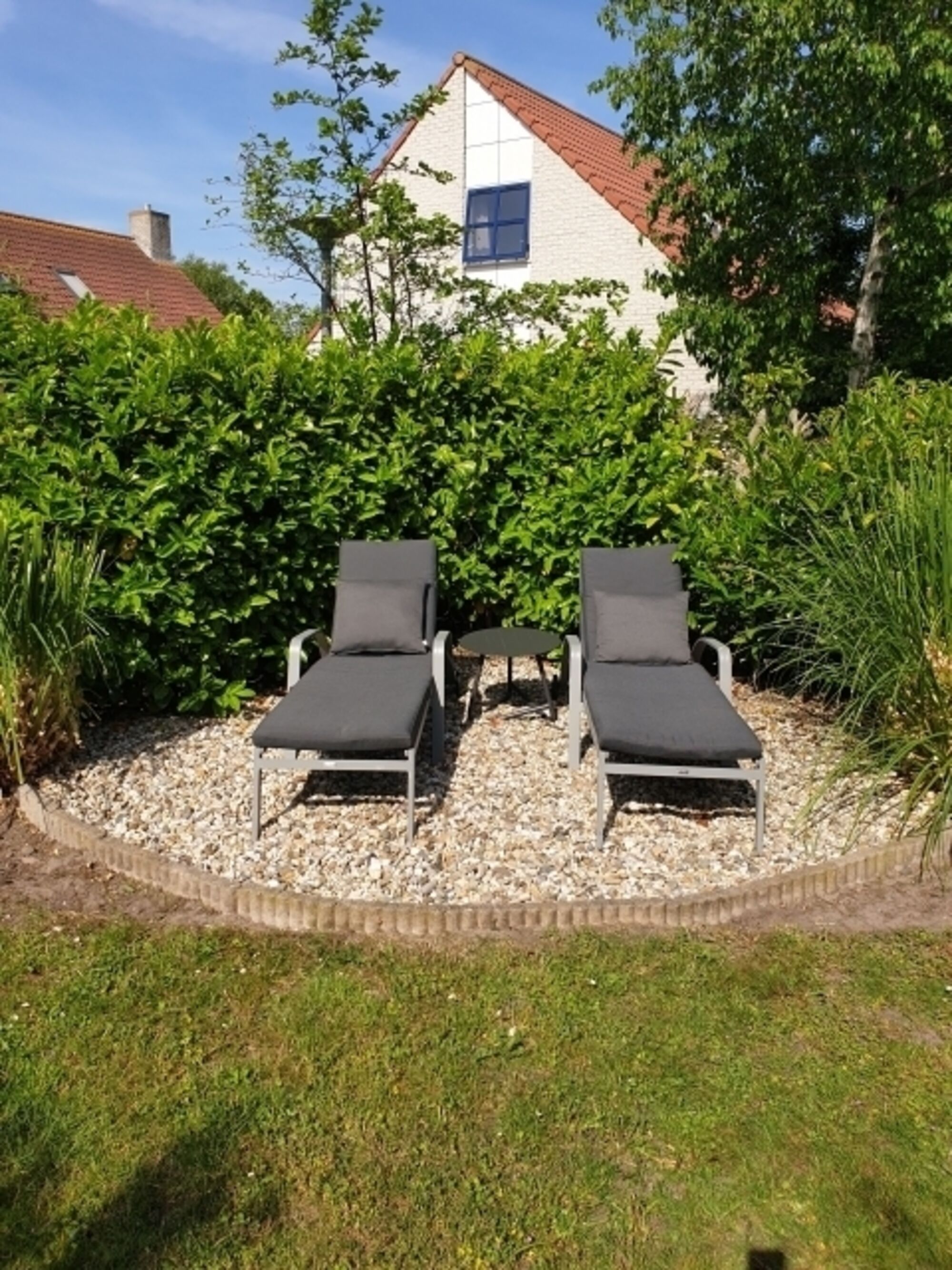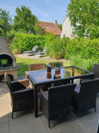 eine Südterrasse mit schönen Gartenmöbeln, Grillkamin und Sonnenliegen