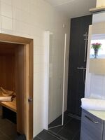 Ein Badezimmer im EG mit Sauna und separater barrierefreier Dusche, separates Gäste-WC und ein weiteres Duschbad mit WC im OG.