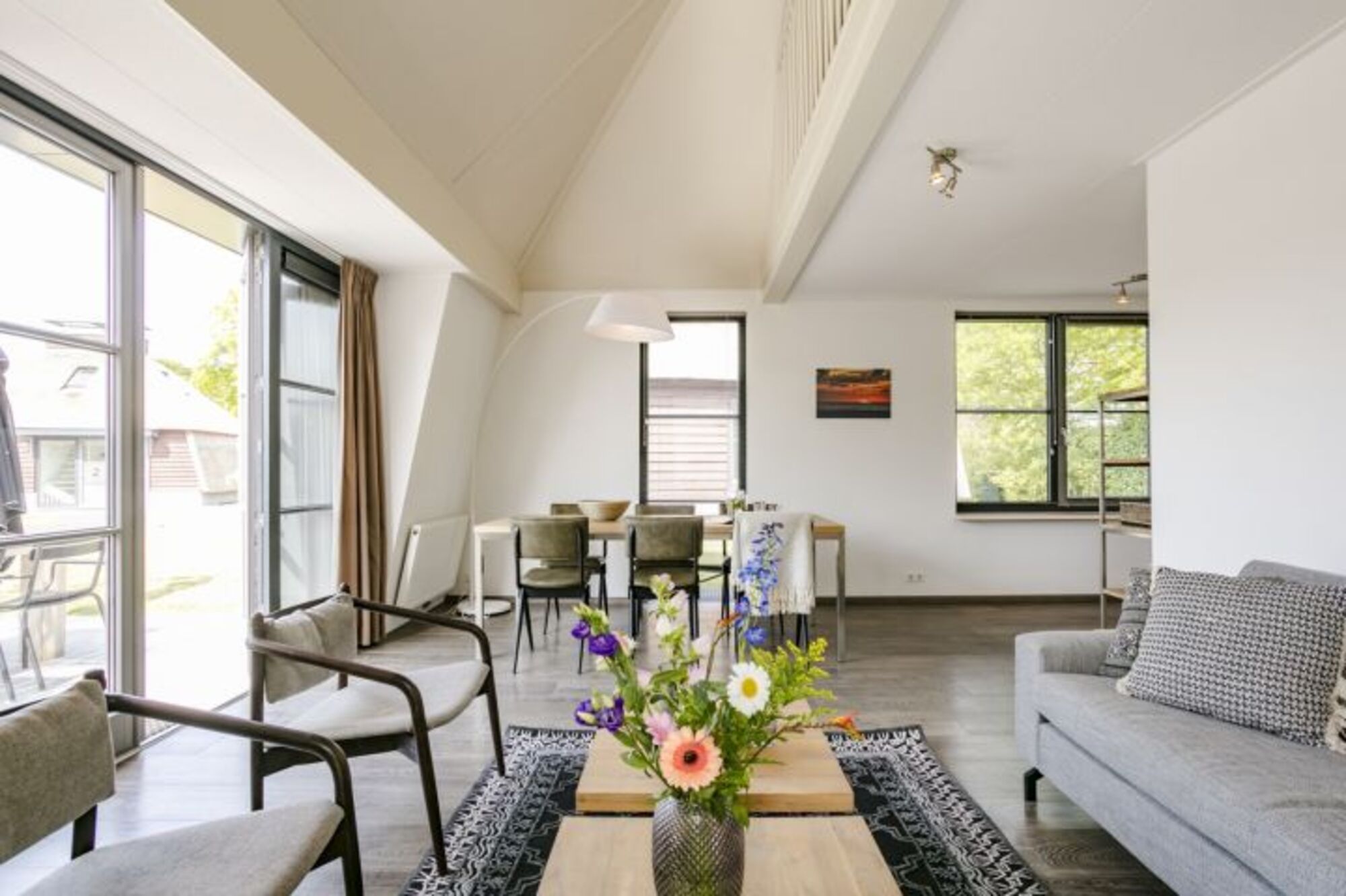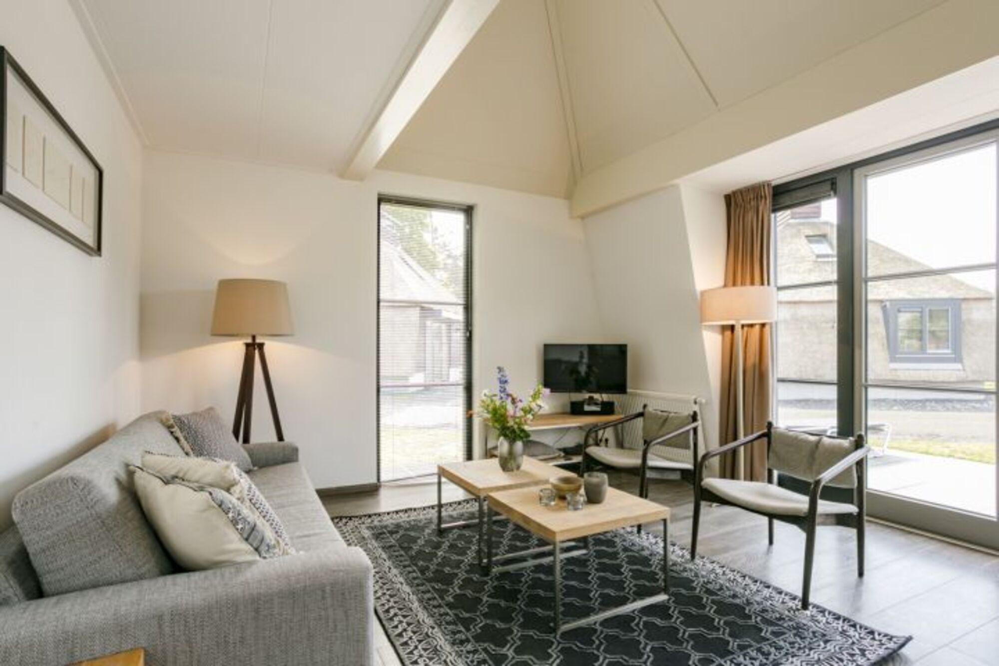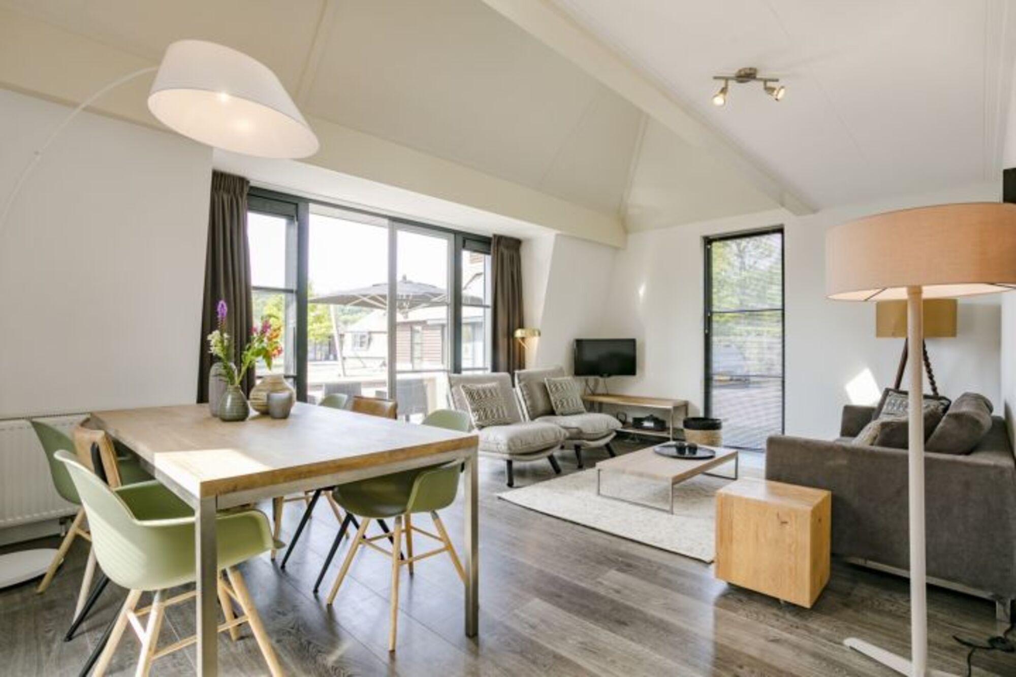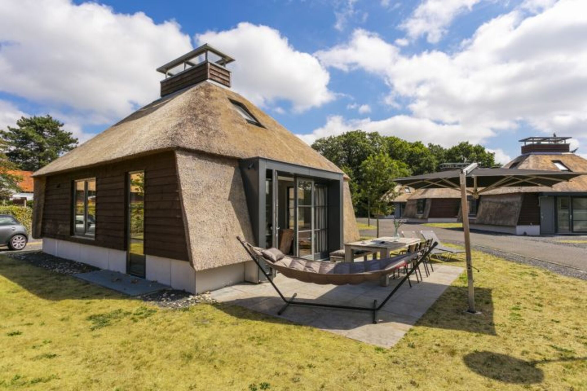 Durch die Flügeltüren im Wohnzimmer gelangen Sie auf die Terrasse an der Vorderseite des Ferienhauses. Die Terrasse ist komfortabel ausgestattet mit Terrassenmöbeln und großem Sonnenschirm.