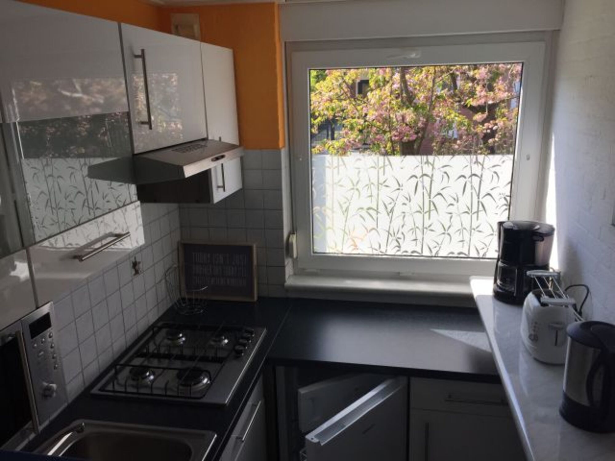 Die Küche ist neu renoviert, gut ausgestattet unter anderem mit einem großen Gaskochfeld, Mikrowelle, Kaffeemaschine, Toaster und Spülmaschine.