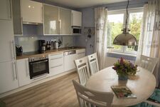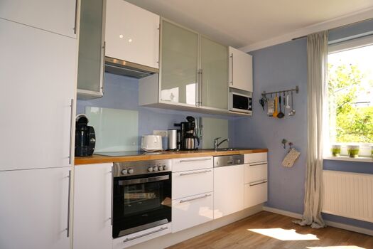 Cerankochfeld, Dunstabzugshaube, Kühlschrank mit Gefrierfach, Tassimo-Kaffeautomat, Mixer, Korkenzieher / Flaschenöffner, Geschirrhandtücher, Essplatz in der Küche