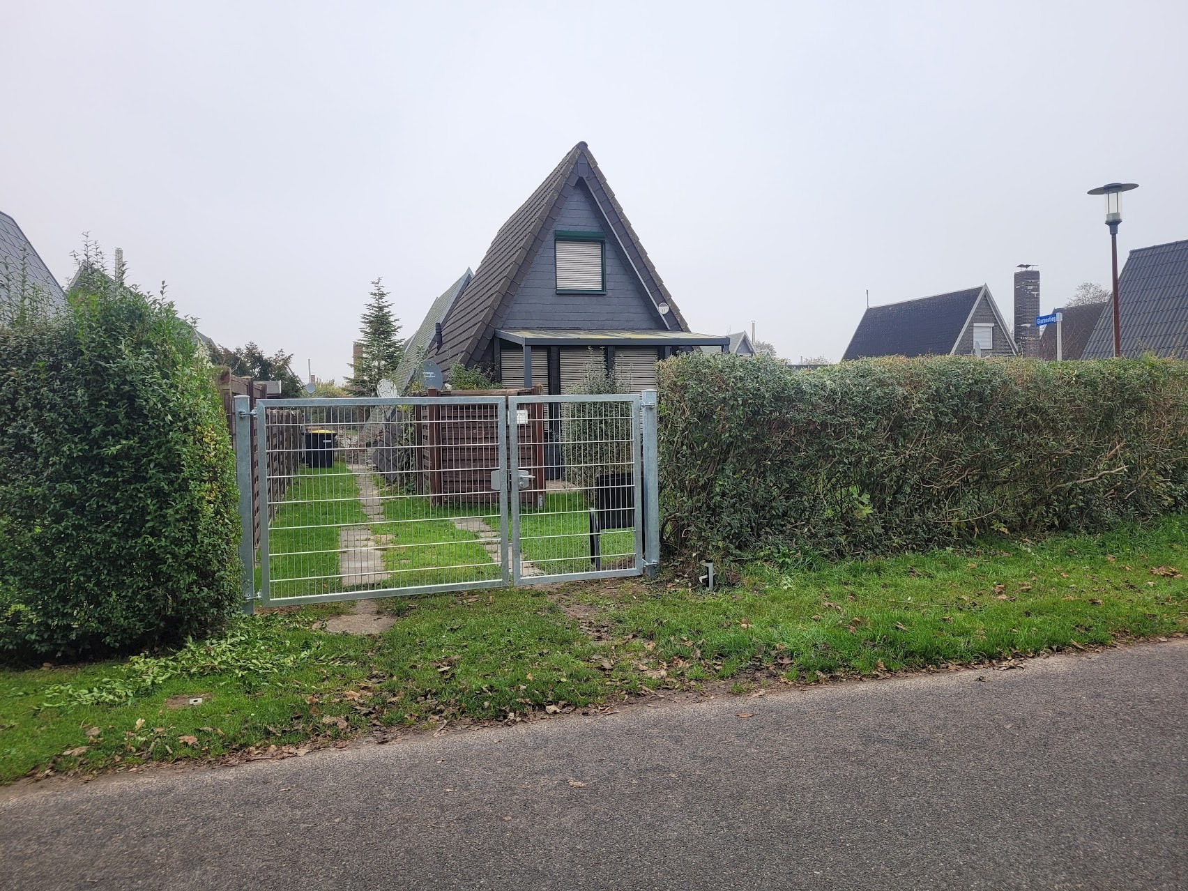 Bollerwagen Rasen für Sonnenbäder oder als Auslauffläche für den Hund Hohes Eingangstor zum Parallelweg Garten eingezäunt