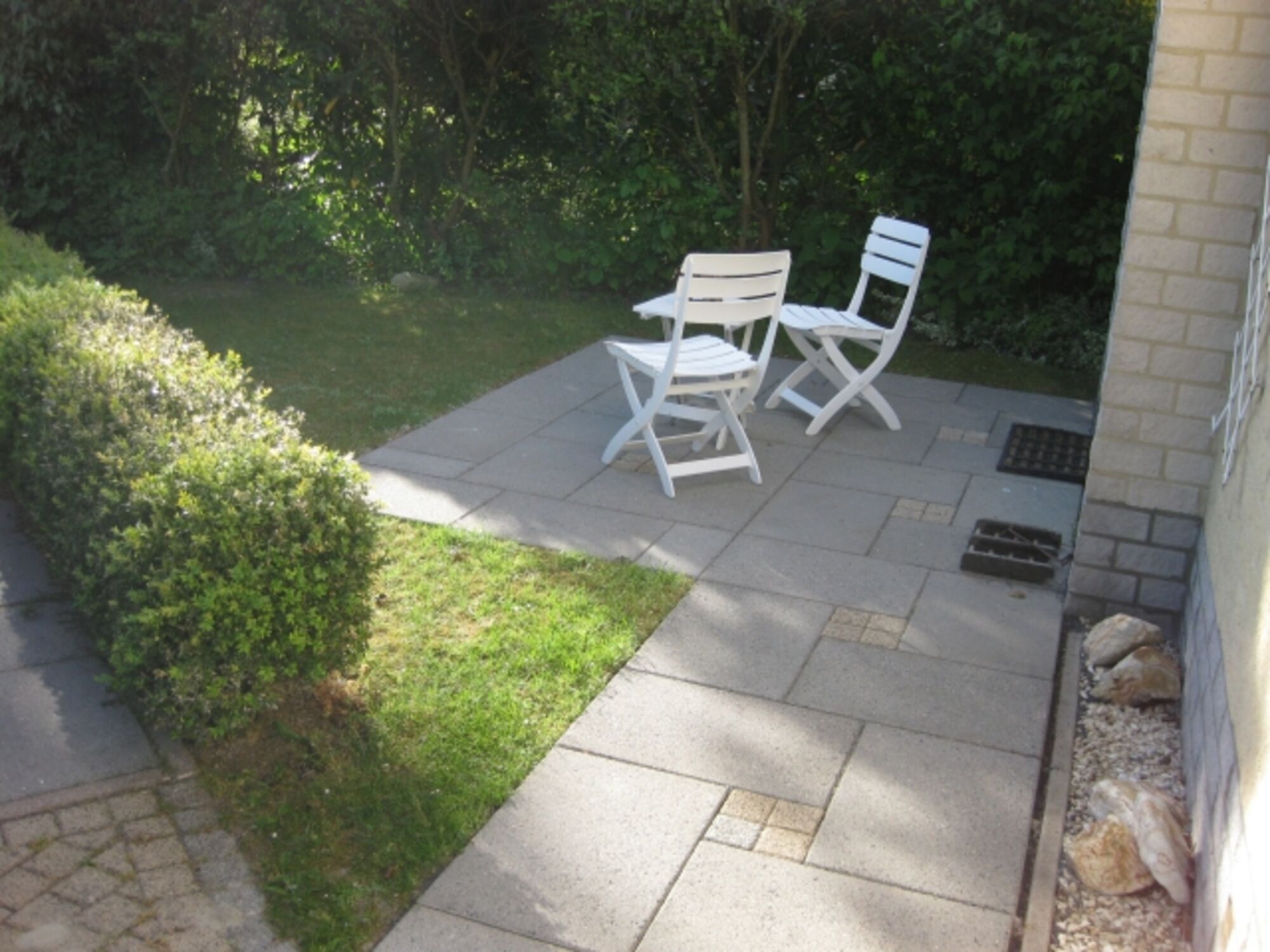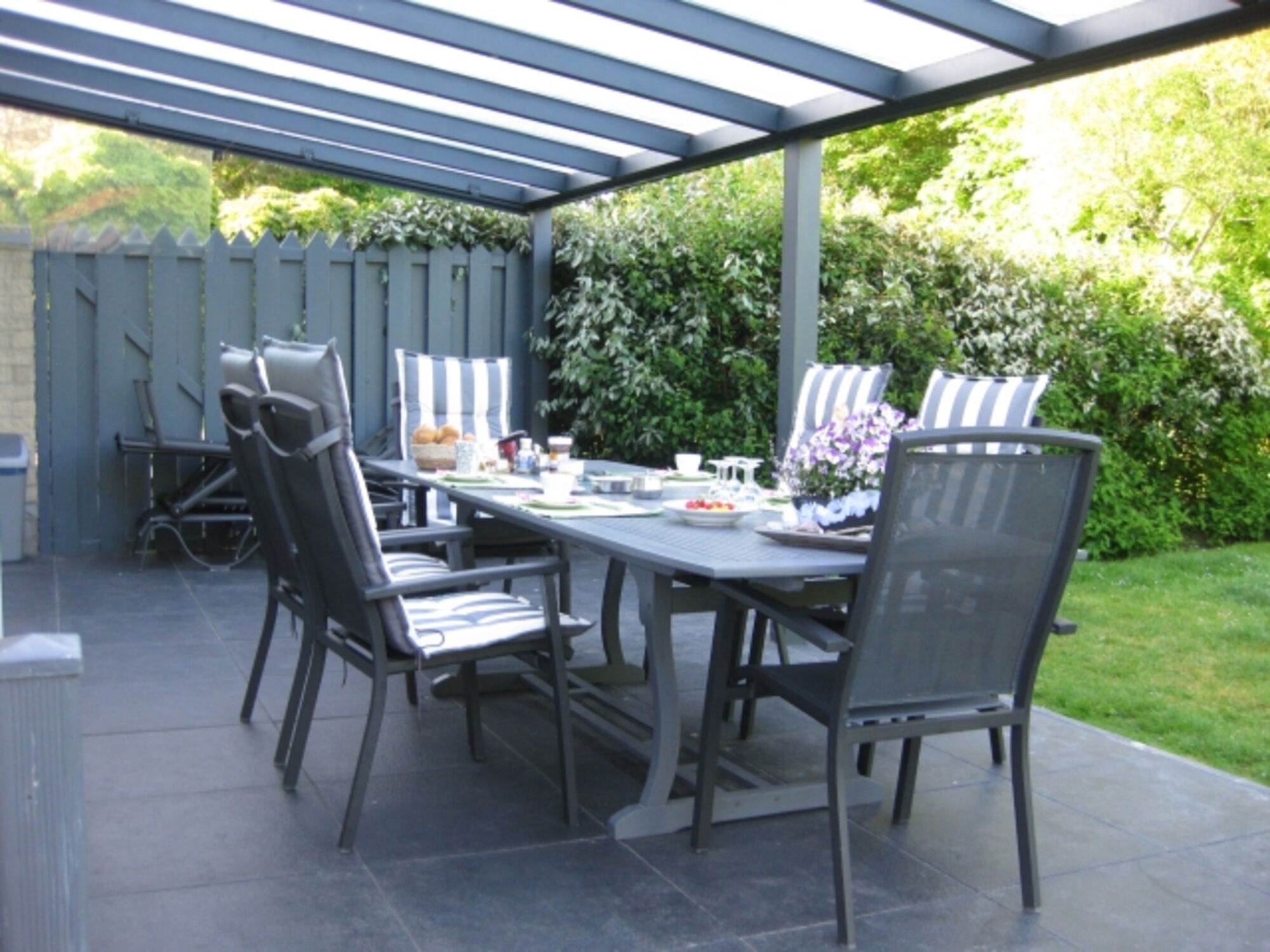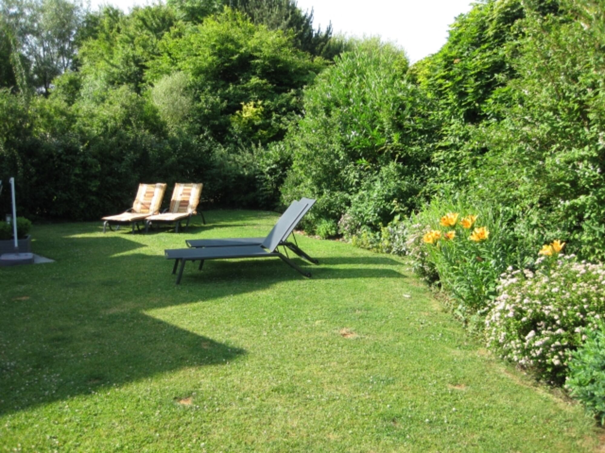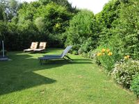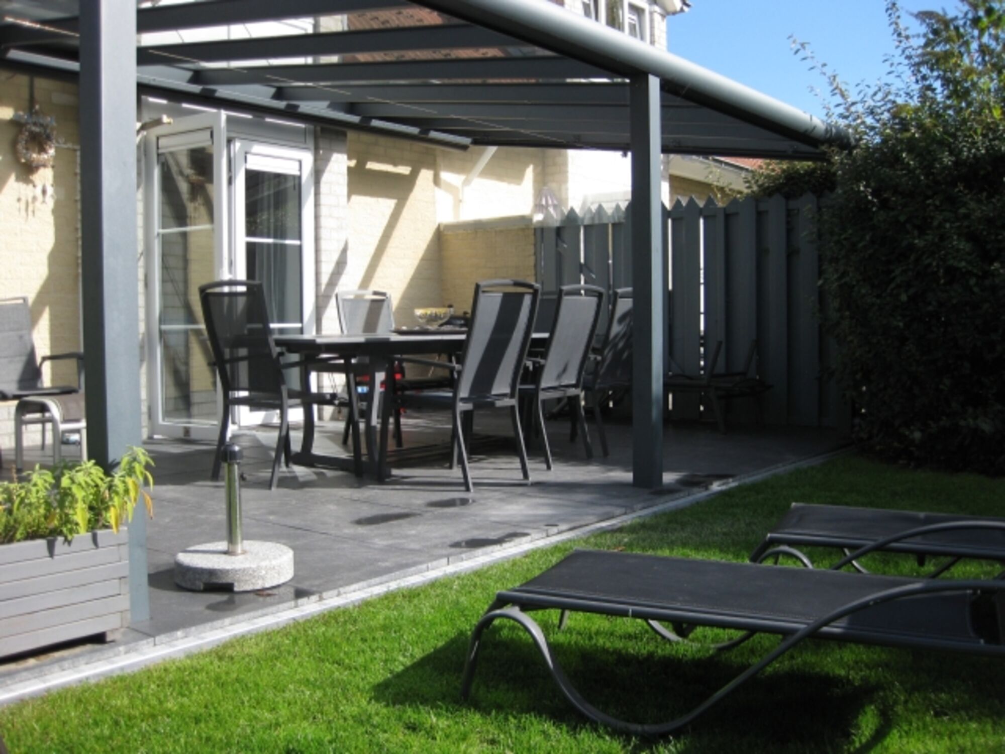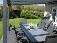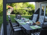 Der sonnige Garten ist ganz eingezäunt- eingewachsen, die große überdachte Terrasse bietet einen Windschutz- Beleuchtung eine elektrische Markise, hochwertige Gartenmöbel 5 Liegen und einen Holzkohlegrill.