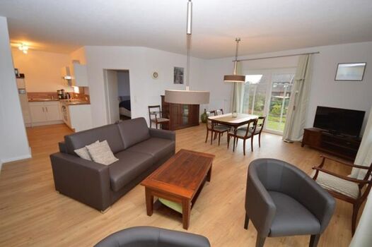 Die beiden Schlafzimmer, ein Bad mit Dusche und der Wohnbereich mit offener Küche sind umfangreich ausgestattet und für einen Aufenthalt mit 4 (6) Personen optimal aufgeteilt. In dem Wohnzimmer können zusätzlich auf dem Schlafsofa oder Klappbetten zwei Personen schlafen.